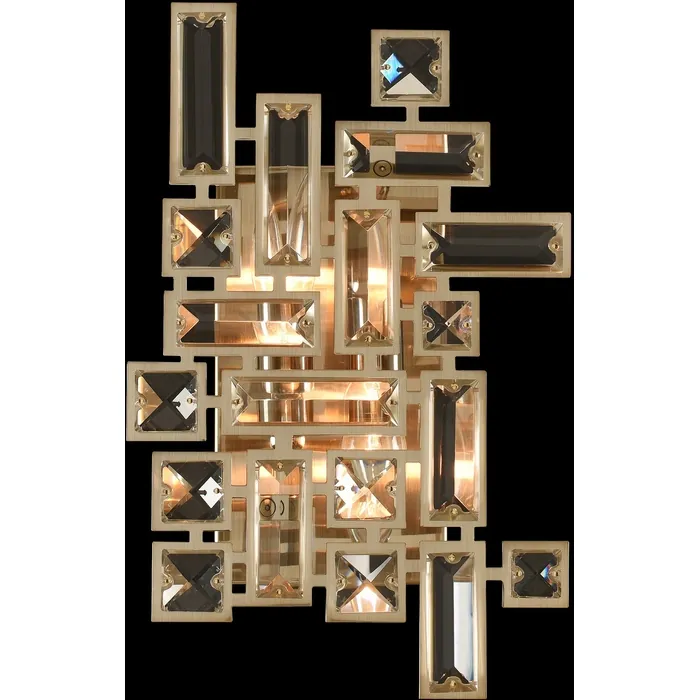 The Vermeer Collection was inspired by the De Stijl Art Movement founded in the Netherlands during the early 20th century. These Clear Prism crystals are arranged in unique patterns that embody the De Stijl principles of rectilinear lines and asymmetry th2 Light Wall BracketE12 Candelabra0Dimmable: YesDimmer Type: Refer to bulb manufacturer for compatibilitySockets: 2Wattage: 40Lamp Type: E12 CandelabraBulbs Incl#: NoMax Height: 12