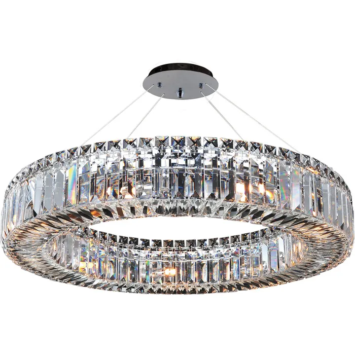 The Rondelle Collection is a simplistically elegant interpretation of modern chandeliers. Each tier is a U-shape consisting of Clear Prism crystals tipped with Clear Square Stone crystals and finished in Allegri’s exclusive Chrome finish. With four shapes26" PendantE12 Candelabra0Dimmable: YesDimmer Type: Refer to bulb manufacturer for compatibilitySockets: 9Wattage: 40Lamp Type: E12 CandelabraBulbs Incl#: NoMax Height: 4