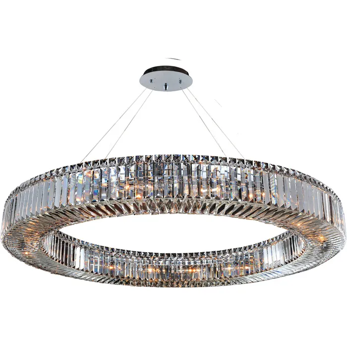 The Rondelle Collection is a simplistically elegant interpretation of modern chandeliers. Each tier is a U-shape consisting of Clear Prism crystals tipped with Clear Square Stone crystals and finished in Allegri’s exclusive Chrome finish. With four shapes47" PendantE12 Candelabra0Dimmable: YesDimmer Type: Refer to bulb manufacturer for compatibilitySockets: 18Wattage: 40Lamp Type: E12 CandelabraBulbs Incl#: NoMax Height: 5