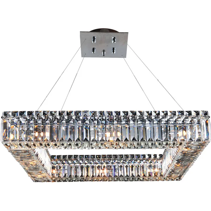 The Quantum Collection is a simplistically elegant interpretation of modern chandeliers. Each tier is a U-shape consisting of Clear Prism crystals tipped with Clear Square Stone crystals and finished in Allegri’s exclusive Chrome finish. With four shapes 26" Square PendantE12 Candelabra0Dimmable: YesDimmer Type: Refer to bulb manufacturer for compatibilitySockets: 12Wattage: 40Lamp Type: E12 CandelabraBulbs Incl#: NoMax Height: 4