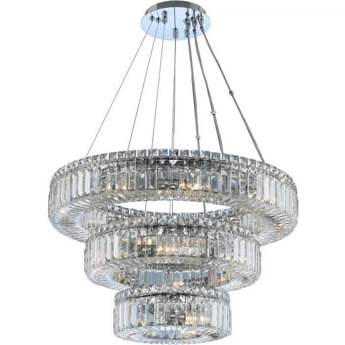 The Rondelle Collection features timeless single and multiple tier polished chrome round pendants of Firenze crystal baguette and squares.(12 + 18 + 26)" 3 Tier PendantE12 CandelabraChandelier0Dimmable: YesDimmer Type: Refer to bulb manufacturer for compatibilitySockets: 18Wattage: 40Lamp Type: E12 CandelabraBulbs Incl#: NoMax Height: 12