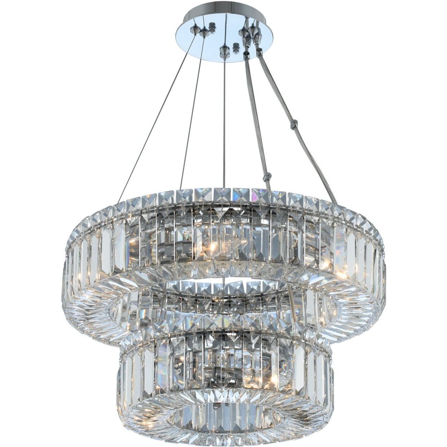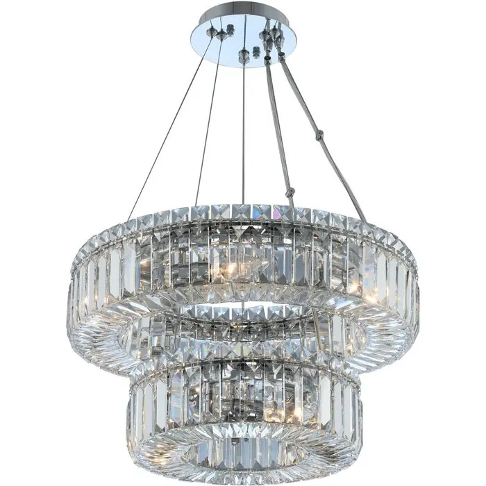 The Rondelle Collection features timeless single and multiple tier polished chrome round pendants of Firenze crystal baguette and squares.(12 + 18)" 2 Tier PendantE12 CandelabraChandelier0Dimmable: YesDimmer Type: Refer to bulb manufacturer for compatibilitySockets: 9Wattage: 40Lamp Type: E12 CandelabraBulbs Incl#: NoMax Height: 8