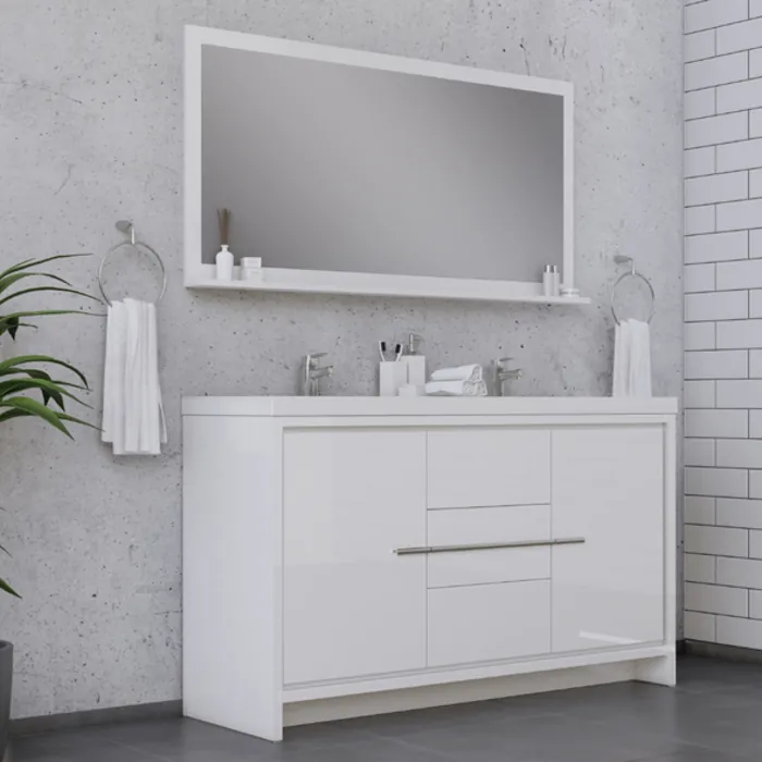 Alya Bath Sortino 60" double bathroom vanity is a great choice for a modern bathroom. This free standing vanity offers great storage with a smooth soft-closing, fully functional three drawers and two doors. The white acrylic sink completes the simple contemporary design and clean lines brings a touch of modern into your bathroom.