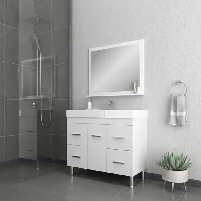 33.13"H x 39.25"W x 18.75"DHighest quality MDF/Wood veneer cabinet.White cabinet. White acrylic sink. Pop-up drain assembly. Self closing door & drawers. Matching mirror available but not included. Side cabinet available but not included. Vanity has opening for plumbing. Single hole faucet openings. Minimal assembly required (finished cabinet).Faucets are available but not included. Please check our faucets page. Legs Included: Yes Mirror Included: No Mounting: Free-standing Top Material: Acrylic Sink Included: Yes Base Material: Highest Quality MDF and Veneer Top Finish: White Style: Modern Number of Sinks: 1 Hardware Finish: Chrome Pop-up Drain, Brushed Chrome Knob Cabinet Hardware Included: Yes Hand Painted: No Number of Doors: 1 Number of Drawers: 4 Drain Assembly Included: Yes Drain Type: Pop-Up Faucet Installation Type: Single-Hole Faucet Included: No Side Cabinet Included: No Assembly Required: No Backsplash Included: No Sidesplash Included: No Weights & Dimensions Overall: 33.13"H x 39.25"W x 18.75"D Mirror: 26.2" H x 39.6" W- 39"W x 19"D x 36"H