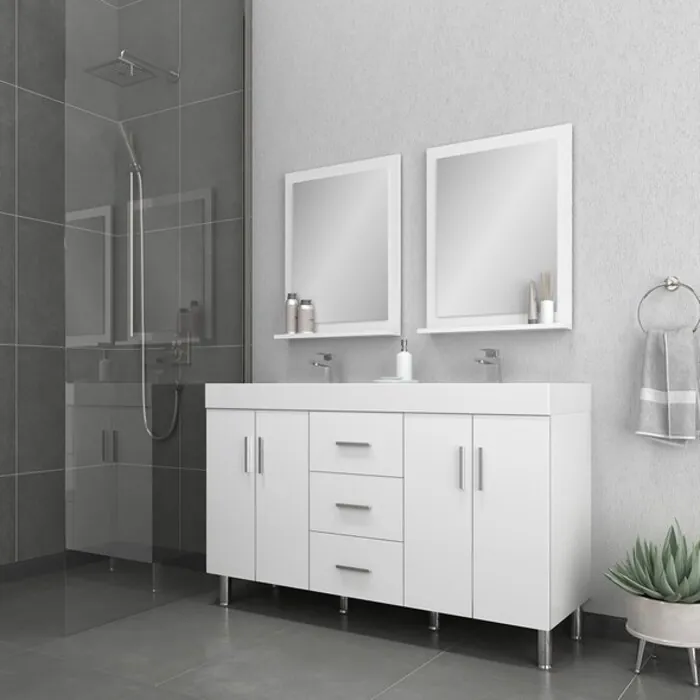 The idea of double vanity is redefined with this European design 56” Bathroom Vanity. Space and storage is crowned with elegance and convenience. The Acrylic Resin basin is tough and integrated one-piece beauty. Available in multiple finish options, matching mirror and side cabinet can be added to amplify your bathroom experience.