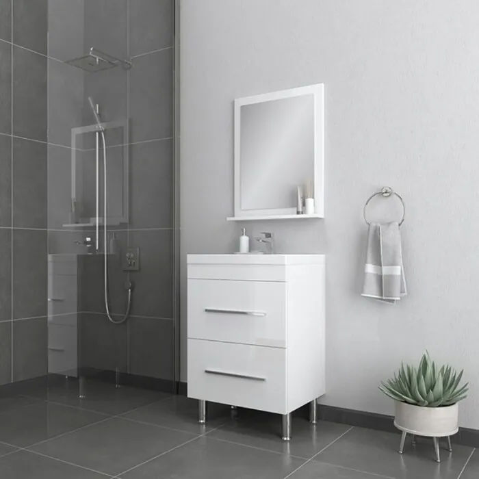 A well equipped 24€ Bathroom Vanity with two functioning self closing drawers, integrated single faucet hole Acrylic Resin basin will satisfy every small bathroom project. Offered in various different finishes, it requires a minimum assembly. Along with the matching mirror, and a same finish side cabinet can complete the elegant look any bathroom deserves.