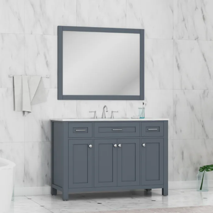 The 48" Gray Norwalk Collection is the true definition of sophistication and class. What makes this collection unique is it is constructed of 100 percent solid hardwood. For easy installation, each vanity comes fully assembled with the marble counter top and ceramic sink attached to the base. Every drawer is also constructed of all hardwood plywood with ¾" dovetails and full-extension, under mount soft closing glides. This stylish cabinet is designed to sit flush against the wall. Already assembled brushed nickel hardware will be sure to complete the elegant look of your bathroom. Real Italian White Carrara marble top is factory pre-sealed to prevent any staining and watermarks. Designed with a smaller space in mind, this vanity has plenty of countertop space and drawer space for all of your toiletry needs.
