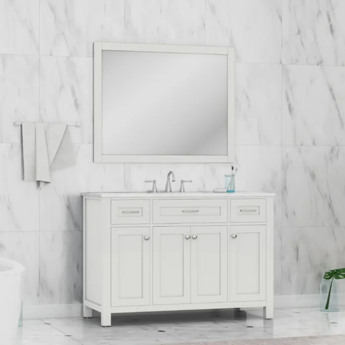 The 48" Linen White Norwalk Collection is the true definition of sophistication and class. What makes this collection unique is it is constructed of 100 percent solid hardwood. For easy installation, each vanity comes fully assembled with the marble counter top and ceramic sink attached to the base. Every drawer is also constructed of all hardwood plywood with ¾" dovetails and full-extension, under mount soft closing glides. This stylish cabinet is designed to sit flush against the wall. Already assembled brushed nickel hardware will be sure to complete the elegant look of your bathroom. Real Italian White Carrara marble top is factory pre-sealed to prevent any staining and watermarks. Designed with a smaller space in mind, this vanity has plenty of countertop space and drawer space for all of your toiletry needs.