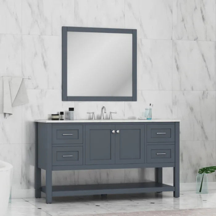 The 60" single sink Wilmington Collection in Gray color finish provides a contemporary design that is perfect for any bathroom remodel and offers the expected security of durability. Being constructed of 100 percent solid hardwood makes this collection one of a kind. For easy installation, each vanity comes fully assembled with the marble counter top and ceramic sink attached to the base. This stylish cabinet is designed to sit flush against the wall. Already assembled brushed nickel hardware will be sure to complete the elegant look of your bathroom. Real Italian White Carrara marble top is factory pre-sealed to prevent any staining and watermarks. Designed with a smaller space in mind, this vanity has plenty of countertop space and a roomy display bottom shelf.