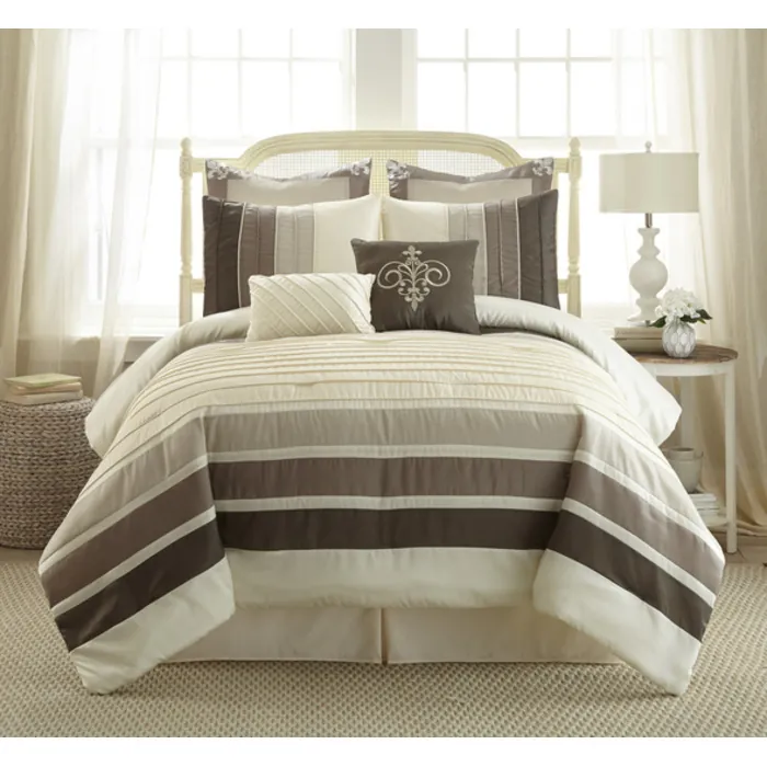 Update your bedroom with this soft and attractive eight-piece comforter set. The polyester filling gives just the right fluffiness to this comforter set while the bar tacking details give a more formal finished look. This set includes embroidery-detailed euro shams, decorative pillows, pillow shams, and a tailored bed skirt, not to mention an oversized, overfilled comforter wrapped in 100-percent polyester.