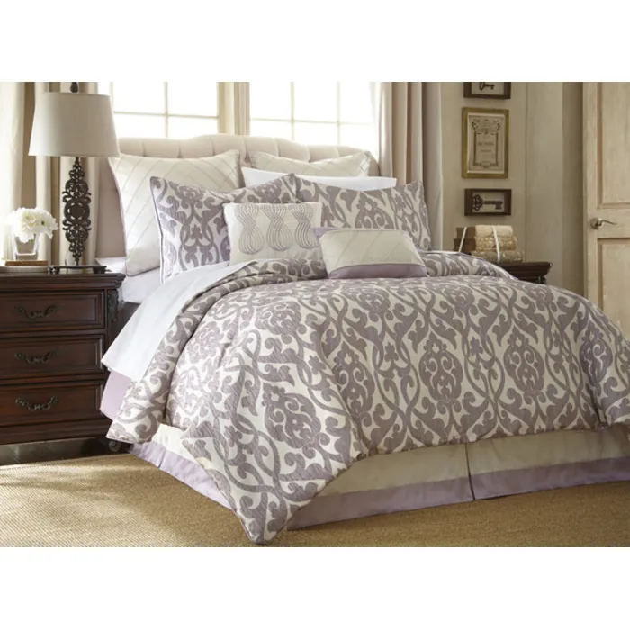 Update your bedroom with this soft and attractive eight-piece comforter set. The polyester filling gives just the right fluffiness to this comforter set while the bar tacking details give a more formal finished look. This set includes embroidery-detailed euro shams, decorative pillows, pillow shams, and a tailored bed skirt, not to mention an oversized, overfilled comforter wrapped in 100-percent polyester.