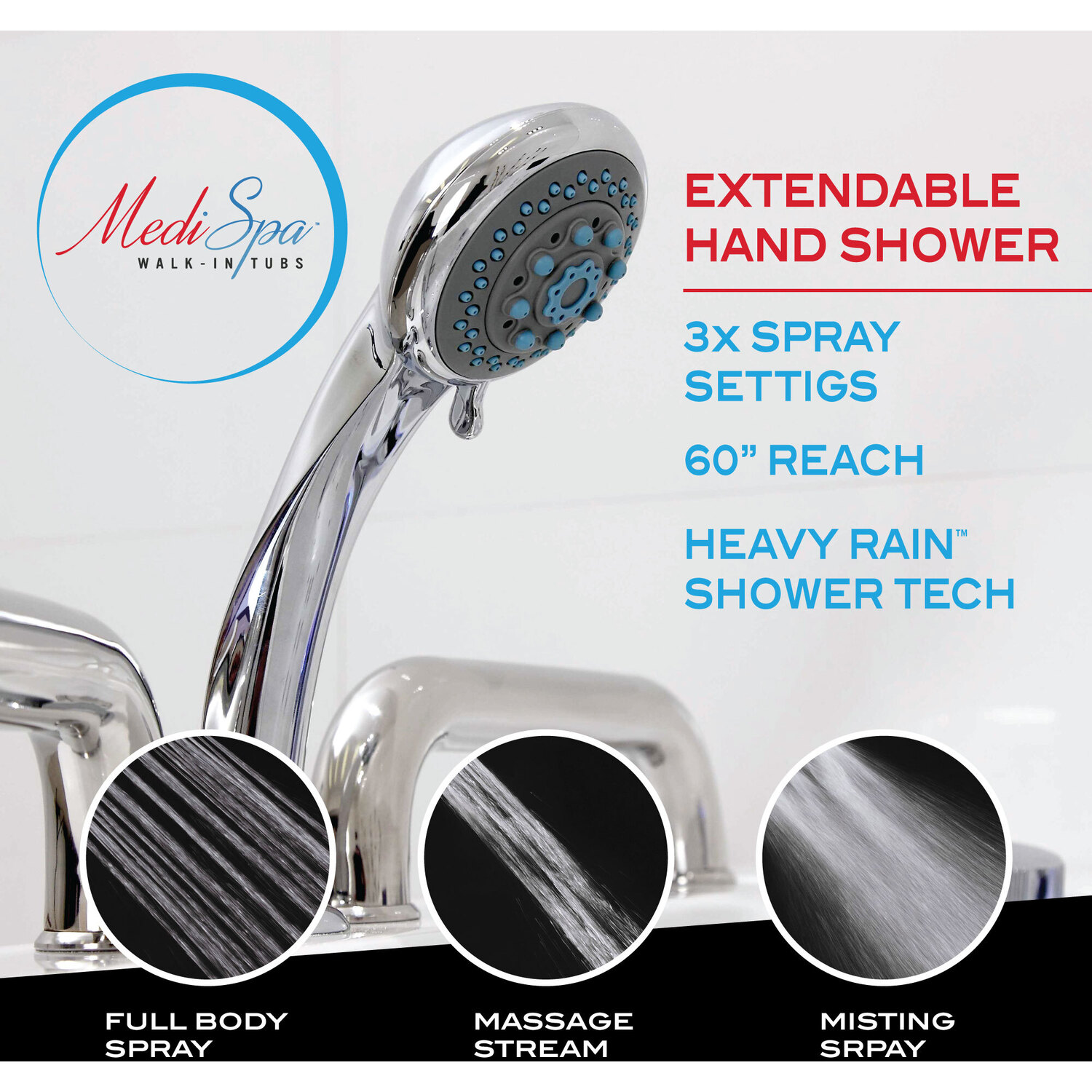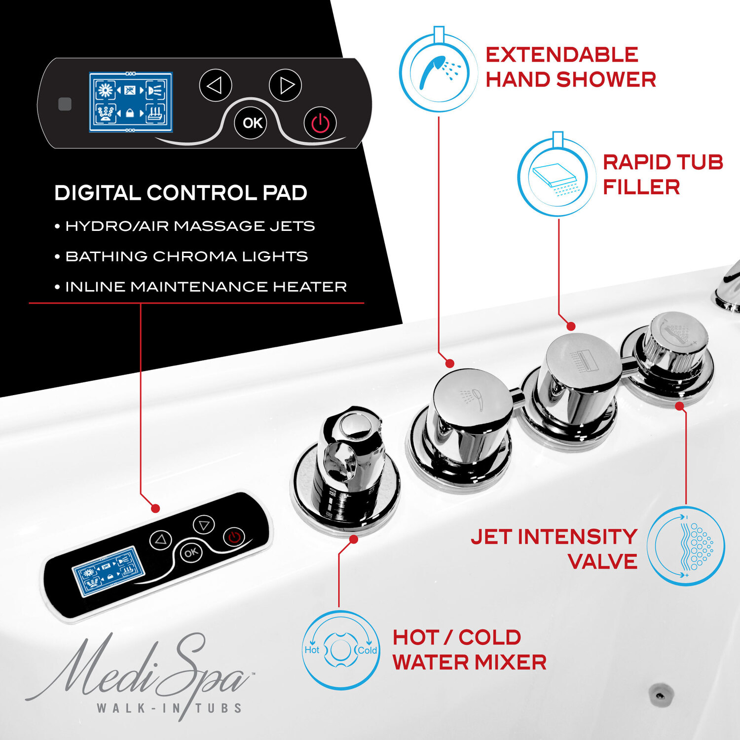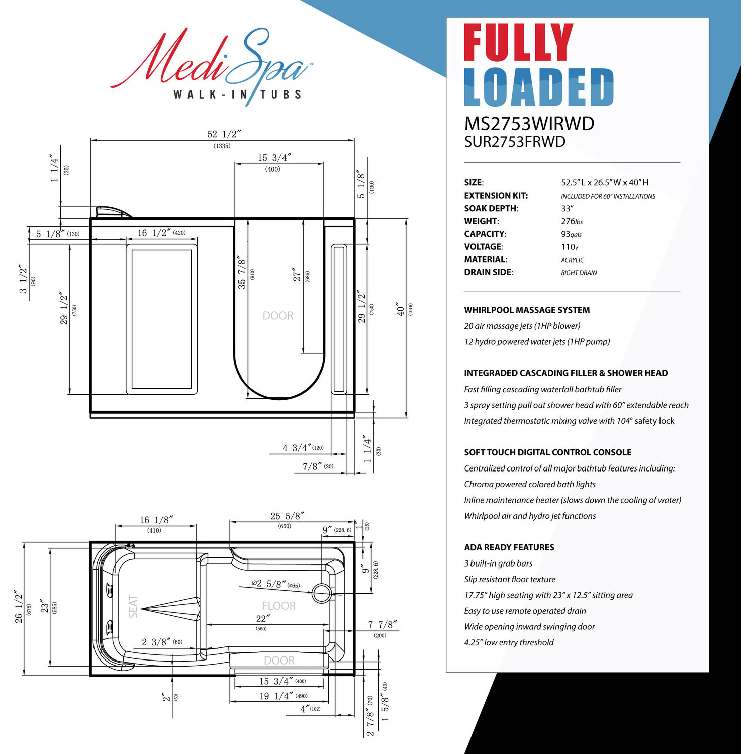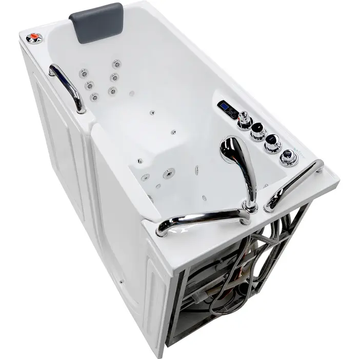 Wide opening door with a Lifetime Warranty protected watertight pressure seal12 fully adjustable hydro-therapeutic whirlpool massage jets18 Acu-Stream air jets for a soothing total body aero-therapeutic massageInline maintenance heater helps maintain water temperature at a comfortable levelIncludes Quick Fill faucet which rapidly fills the tub with water and features a handheld Euro-Grip shower head with a 60" reachAromatherapy - Experience the deeply soothing sensation of enveloping yourself in the rich fragrance of MediSpa's aroma infused massage bubbles.Chromatherapy - Reinvigorate your mind as well as your body by basking in the soothing radiance of Chromatherapy colored light bathingGlossy White marine grade Acrylic with fiberglass reinforcement and a freestanding steel support frameThe built in Safe Reach grab bars provide vital points of support and balance to help ease your transition into and out of the bathtubSafety suit features include the easy step low threshold, secure footing slip-resistant flooring and ADA compliant built-in seatSoft touch total control console operates all major spa featuresPolished chrome trimmed buttons, jets and hardware exude a modern flairExtension Kit - 7" matching extension kit included for 60" retro fit installationNo tile flange