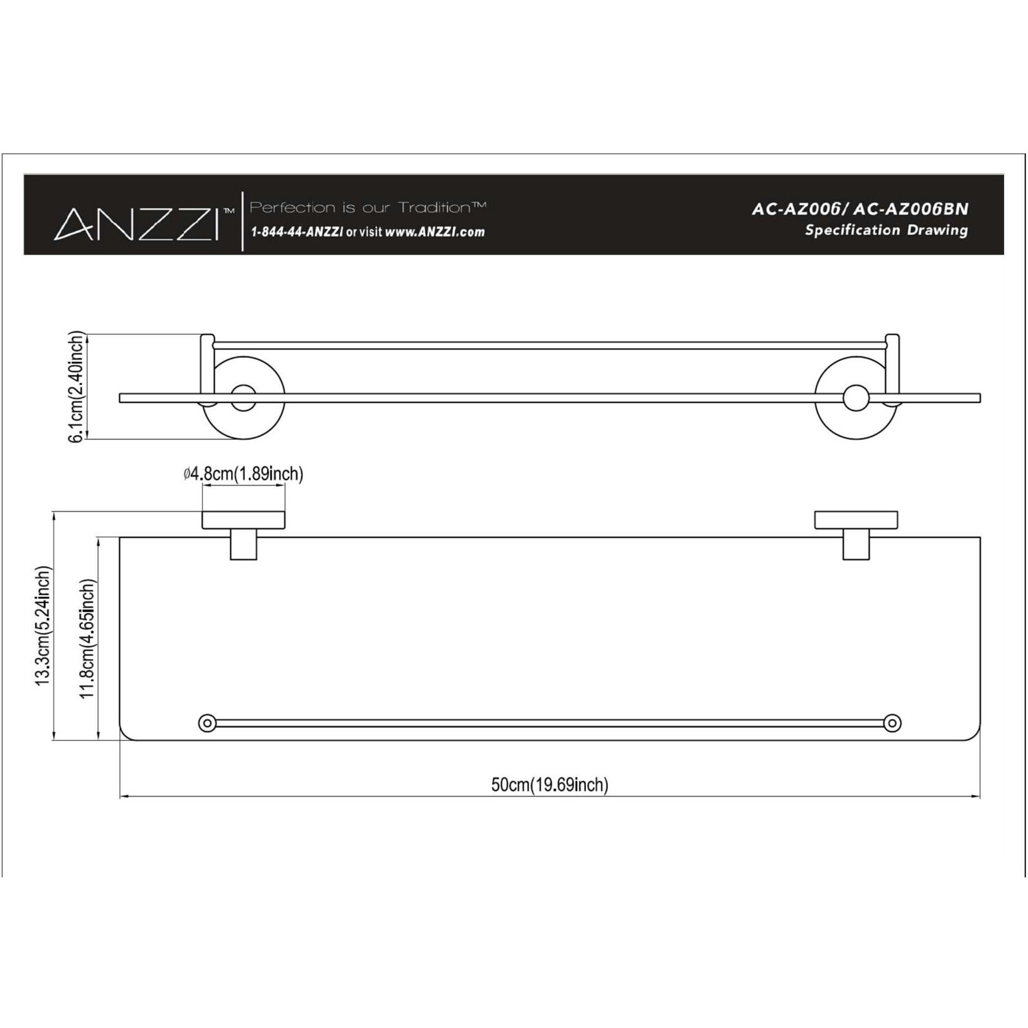 ANZZI bathroom hardware is crafted using RHINO ALLOY certified modern century stainless steel and zinc materials for reliable durability and superior performance. The inspired trending European design is a seamless compliment to any modern or contemporary bathroom décor. This ANZZI wall mounted Caster Series Glass Shelf is cast in a brilliantly striking ANZZI Traditional Brushed Nickel finish.Traditional Brushed Nickel finishRHINO ALLOY certified Ever-Shine Stainless Steel and Zinc constructionBrilliant Scratch Resistant SurfaceEasy wall mounted installation; hardware includedModern European inspired design brought to life through precision German engineeringANZZI tempered Deco-Glass shelfWeight Capacity: 11Ships from factory within 24 hours once order is processedLifetime WarrantyTo speak to a knowledgeable and dedicated ANZZI specialist simply call 1-844-44-ANZZI or visit us on the web at www.ANZZI.com