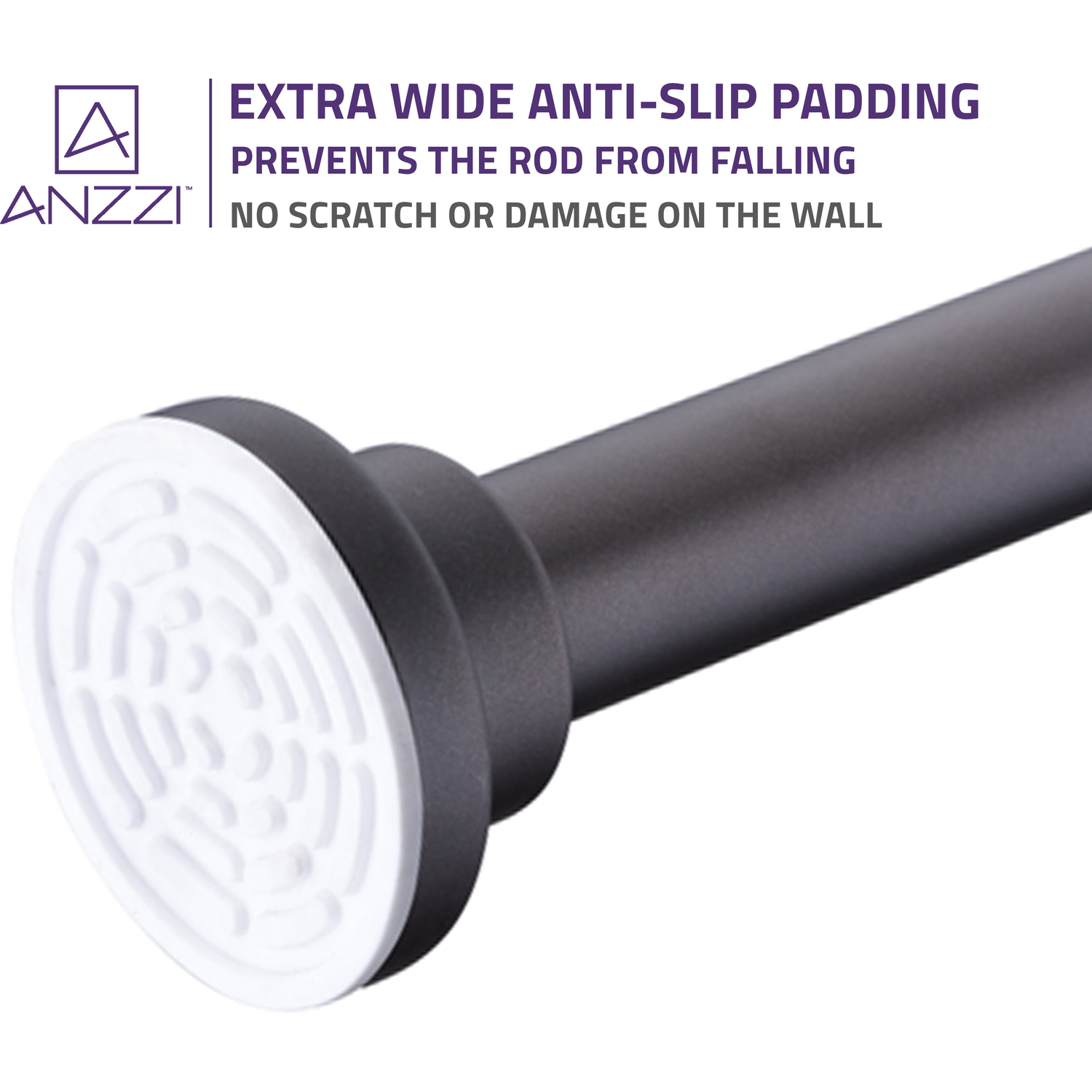 - [ Rubber Suction Cup and Spring Tension Rod ] : Anzzi shower curtain rod offers consistent tension and the sturdy rubber ends help it stay still all the time and will not damage the wall.