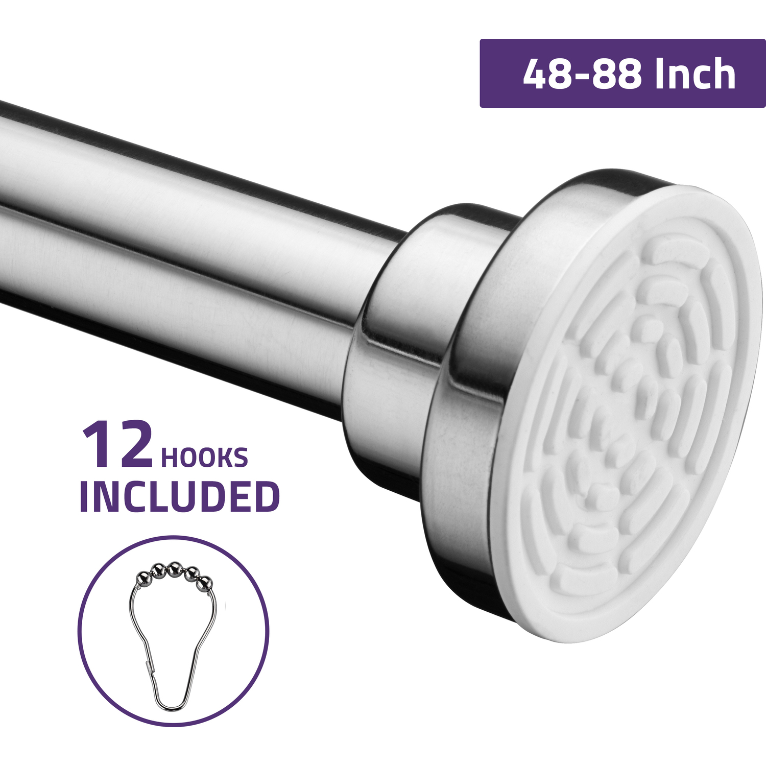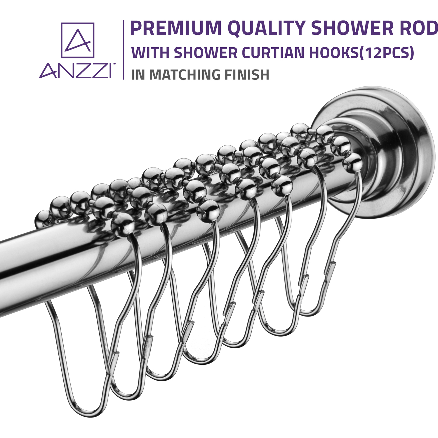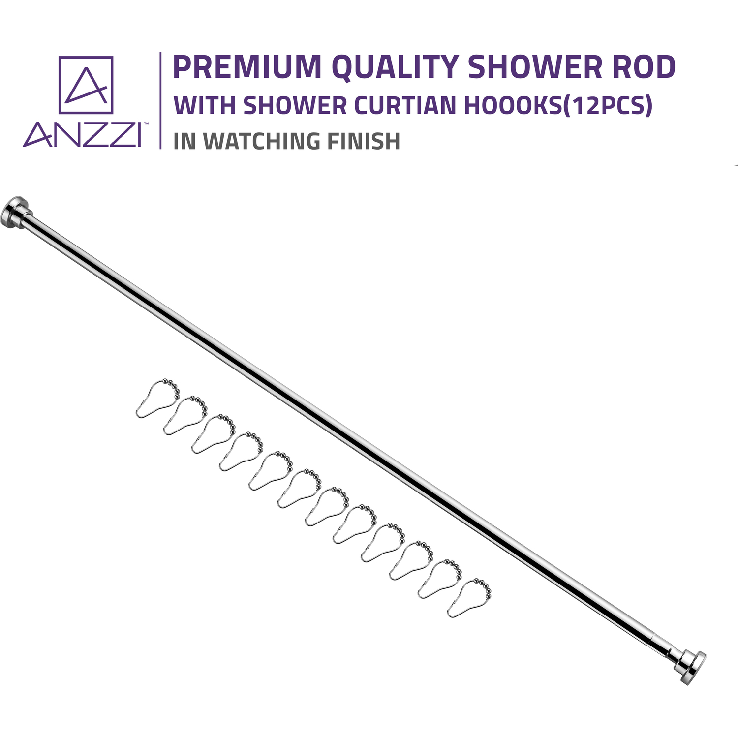 [ Matching Shower Curtain Hooks Included ] : A set of 12 shower curtain rings in matching finish is included in the package and made from stainless steel material for long term use. Catch two birds with one stone![ Rubber Suction Cup and Spring Tension Rod ] : Anzzi shower curtain rod offers consistent tension and the sturdy rubber ends help it stay still all the time and will not damage the wall.[ Multi-functional Tension Rod ] : Anzzi tension shower rods can be used in many areas, such as bathrooms, kitchens, living room and bathroom to hang from light weight curtain to medium weight clothes.[ Easy to Install ] : This adjustable shower tension rod is available from 48 to 88"es. It can be applied to all surfaces from smooth to rough. You can install quickly and a expand easily. No drilling required, Damage and scratch free.[ Risk Free Purchase ] : ANZZI products are manufactured with superior quality standards and workmanship and are backed by our limited lifetime warranty. ANZZI products are warranted to the original consumer purchaser to be free of defects in materials or