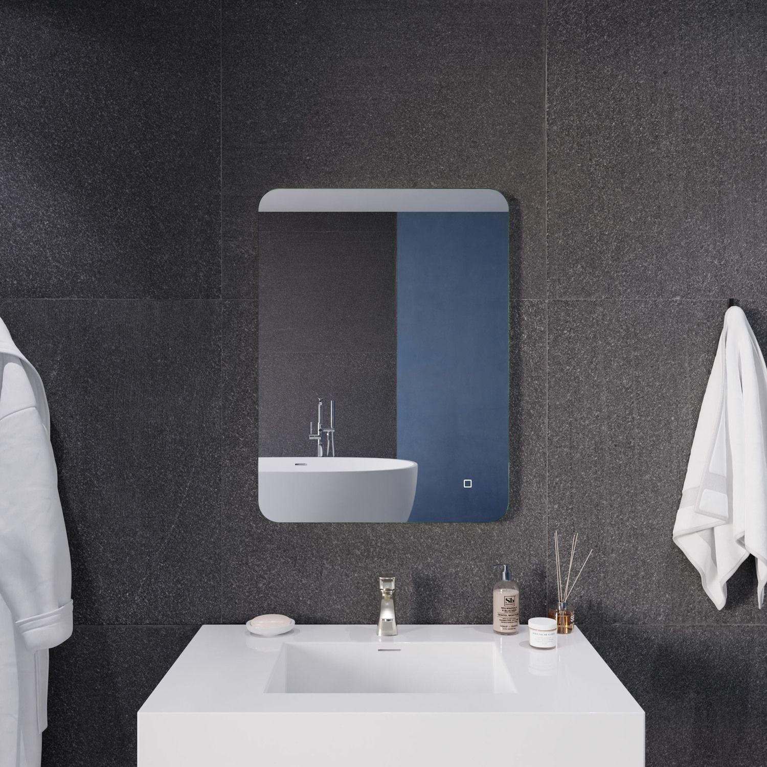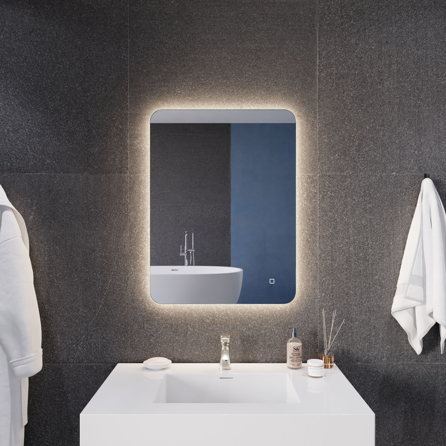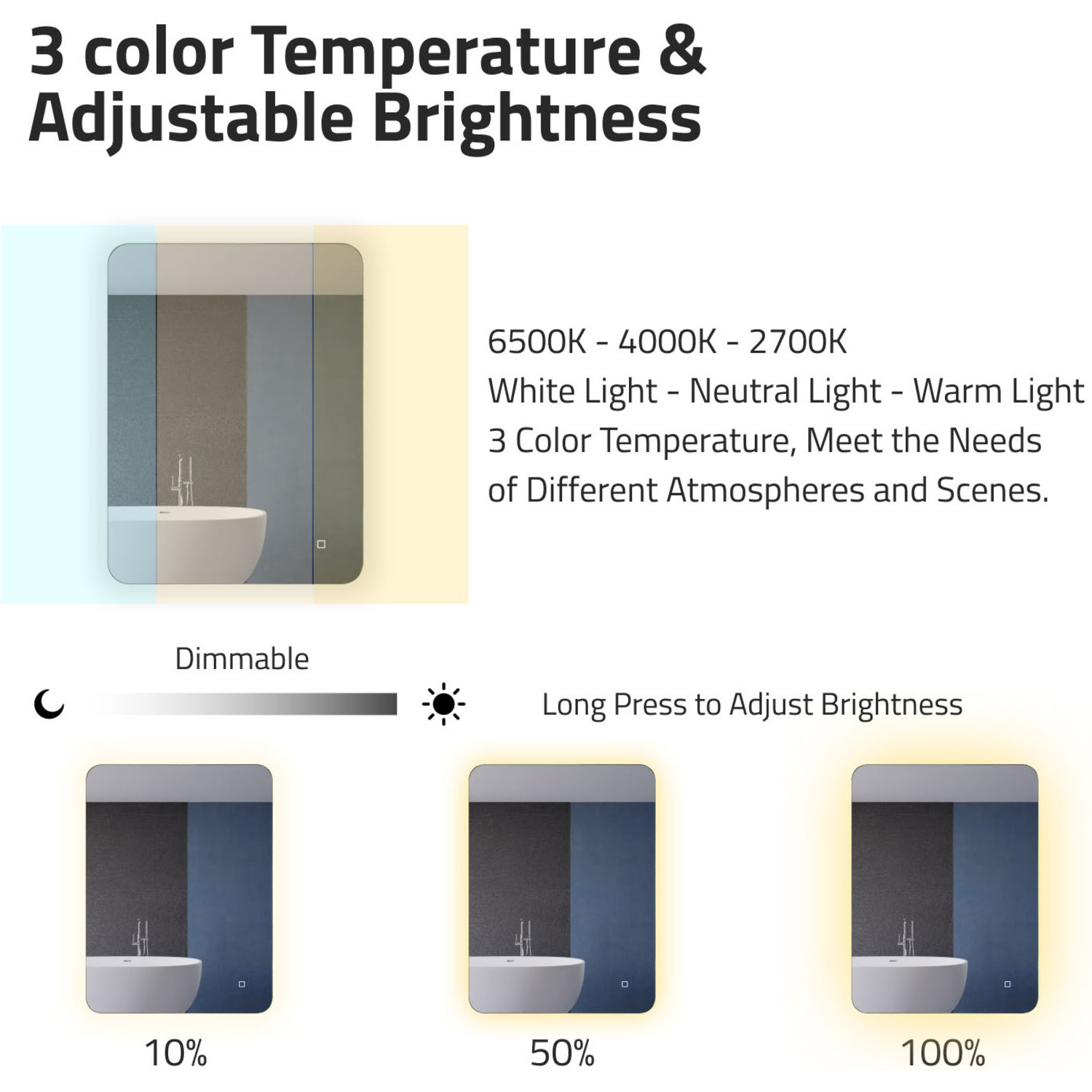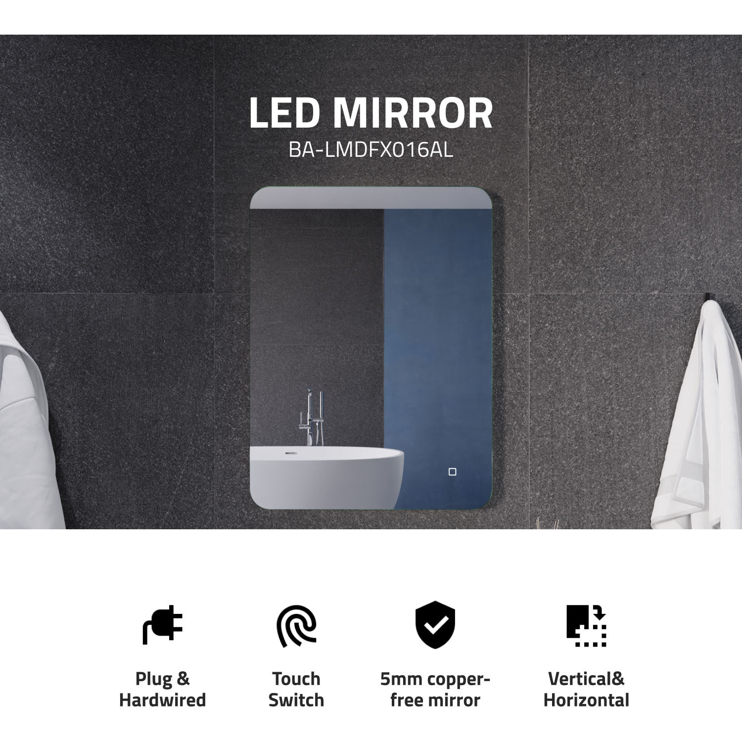 5MM RHINO-ALLOY CERTIFIED, COPPER-FREE MIRROR — resists corrosion, delivers amazing visual clarity and features a safety film backADJUSTABLE COLOR TEMPERATURE — 2700K-6500K high-output LED strip lets you choose your preferred lighting levelBUILT-IN DEFOGGER — keep your mirror free from condensation with the touch of a buttonHANGS HORIZONTALLY OR VERTICALLY — you choose what best fits your spaceELECTRONICS AND LED DRIVER ARE UL-CERTIFIED — our mirrors meet all the latest safety standards5-FT. CORD WITH PLUG — simply plug into an outlet or remove the plug for hardwire installationINCLUDES EVERYTHING YOU NEED — package includes mounting hardwareIP44 Waterproof and Dustproof: Our LED mirrors are designed with a high IP44 rating, ensuring safe and environmentally friendly lighting in wet bathroom environments. Enjoy a worry-free experience with waterproof and moisture-proof backing that adds an exShatterproof and Corrosion Proof: We prioritize your safety! Our copper-free mirrors are three times more resistant to corrosion than traditional mirrors, guaranteeing a longer lifespan. The shatter-resistant coating prevents glass from spreading, reducinTop Quality and Long Endurance: Crafted from 1/5 in. (5 mm) HD environmentally friendly copper-free silver mirror, our LED mirrors offer exceptional clarity and durability. Experience top-notch quality that stands the test of time.Standard Plug/Hardwired: We offer the convenience of both standard plug and hardwired options, ensuring easy installation and compatibility with your bathroom's electrical setup. Choose the method that suits your preferences and needs.Super-Sensitive Touch Button: Experience effortless control with our super-sensitive touch button. Easily adjust the brightness or switch between lighting modes with a simple touch, adding convenience and customization to your daily routine.LIMITED 3-YEAR WARRANTY — when you buy it, we back it, so you can be confident in the quality of our productsGET IT FAST — ships from warehouse within 24 hours of order processing