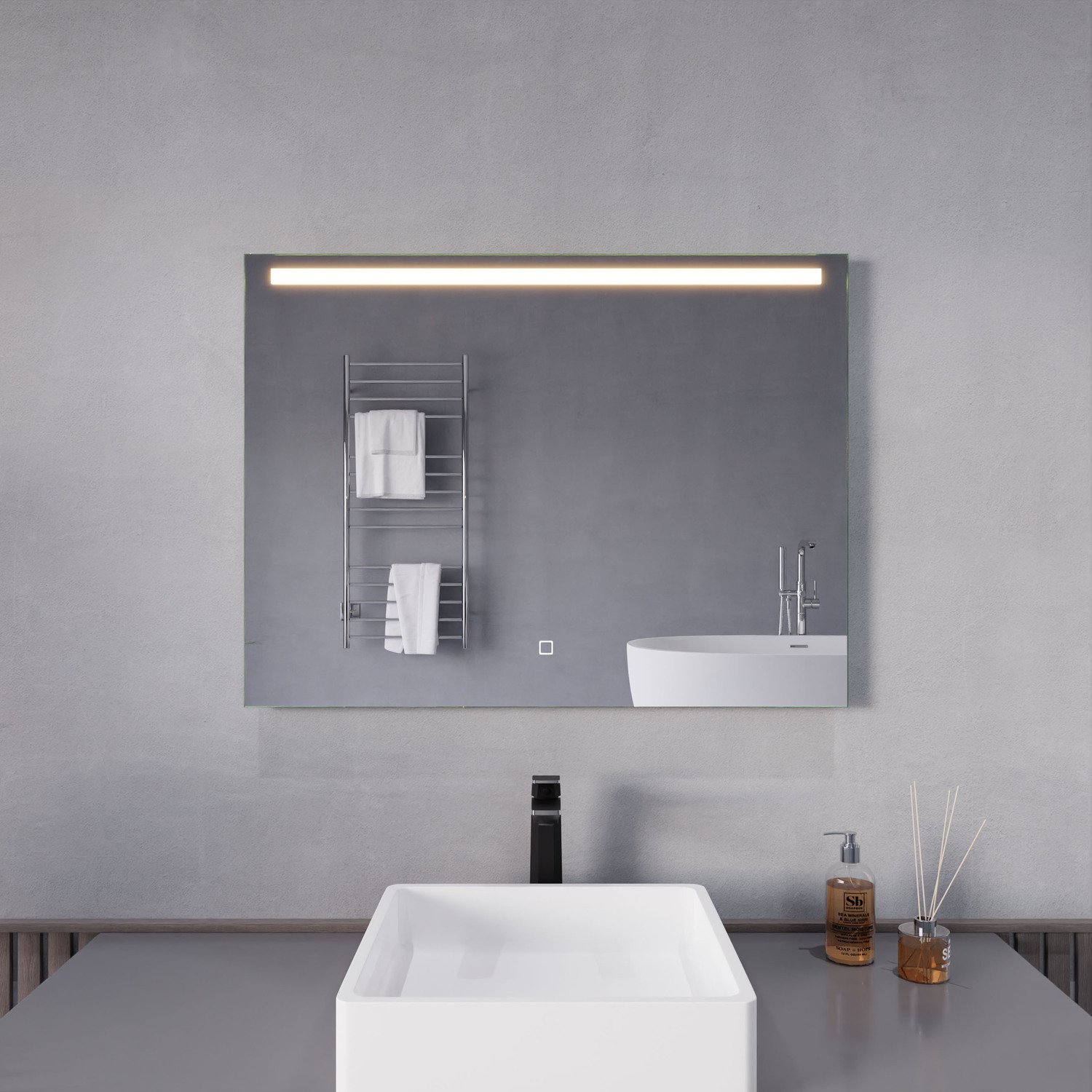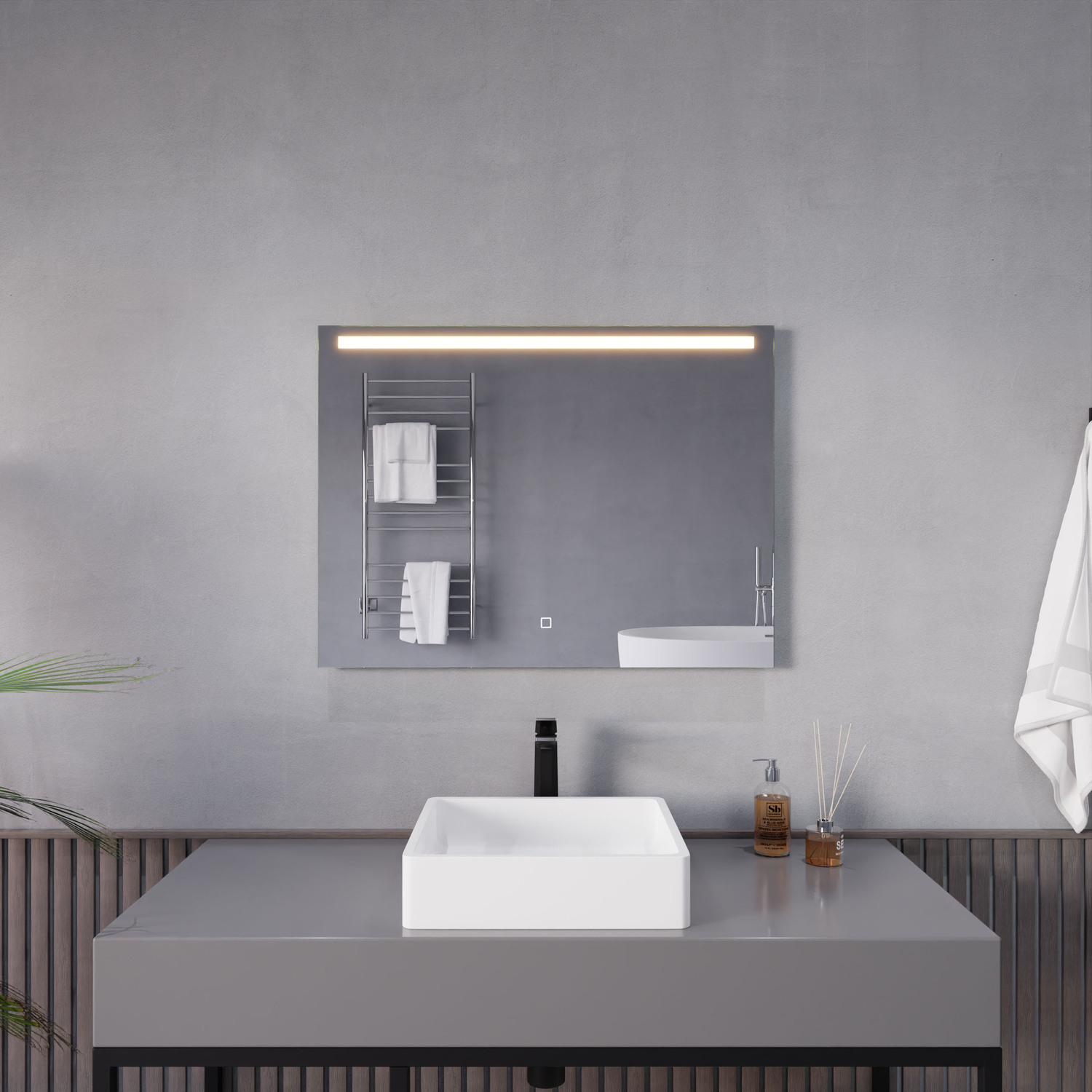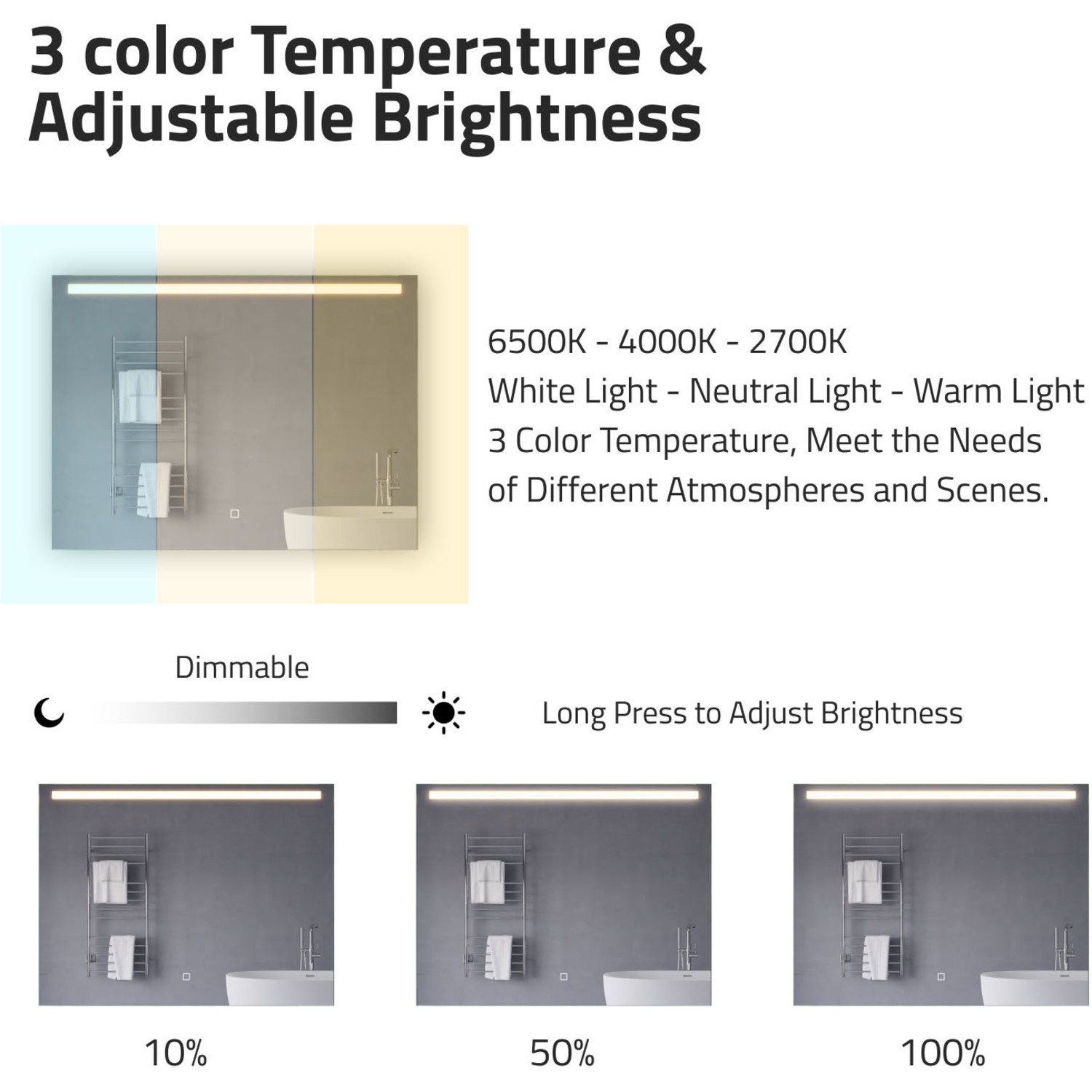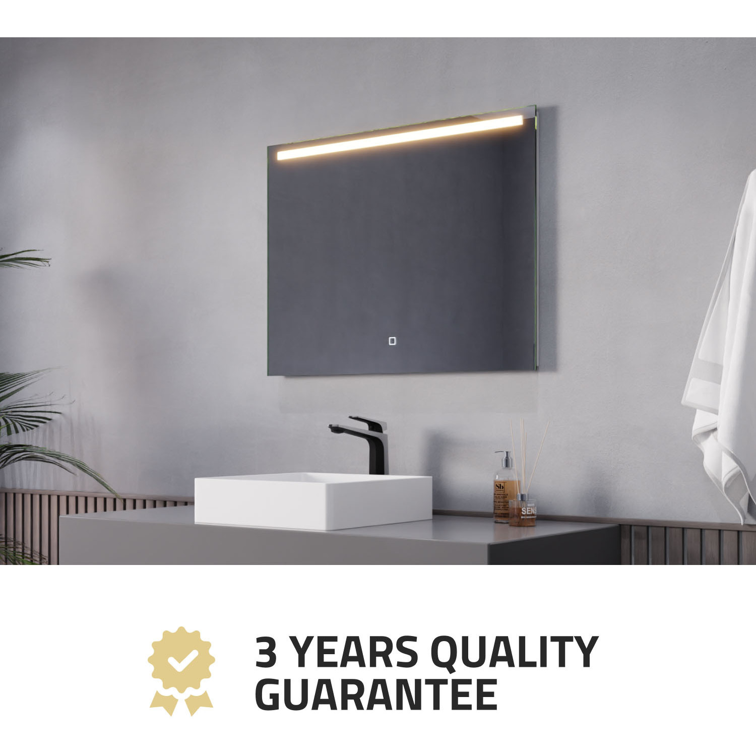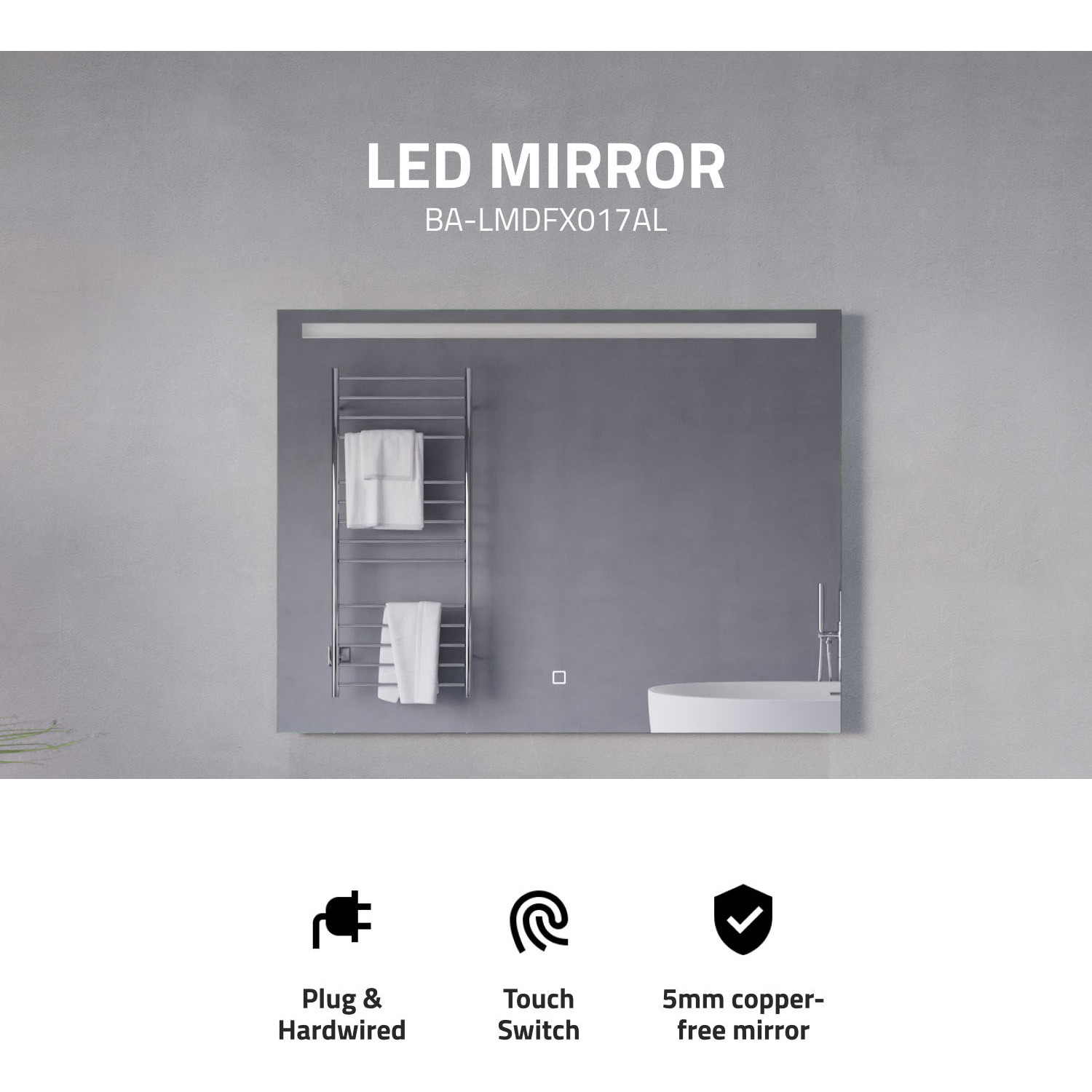 5MM RHINO-ALLOY CERTIFIED, COPPER-FREE MIRROR — resists corrosion, delivers amazing visual clarity and features a safety film backADJUSTABLE COLOR TEMPERATURE — 2700K-6500K high-output LED strip lets you choose your preferred lighting levelBUILT-IN DEFOGGER — keep your mirror free from condensation with the touch of a buttonELECTRONICS AND LED DRIVER ARE UL-CERTIFIED — our mirrors meet all the latest safety standards5-FT. CORD WITH PLUG — simply plug into an outlet or remove the plug for hardwire installationINCLUDES EVERYTHING YOU NEED — package includes mounting hardwareIP44 Waterproof and Dustproof: Our LED mirrors are designed with a high IP44 rating, ensuring safe and environmentally friendly lighting in wet bathroom environments. Enjoy a worry-free experience with waterproof and moisture-proof backing that adds an exShatterproof and Corrosion Proof: We prioritize your safety! Our copper-free mirrors are three times more resistant to corrosion than traditional mirrors, guaranteeing a longer lifespan. The shatter-resistant coating prevents glass from spreading, reducinTop Quality and Long Endurance: Crafted from 1/5 in. (5 mm) HD environmentally friendly copper-free silver mirror, our LED mirrors offer exceptional clarity and durability. Experience top-notch quality that stands the test of time.Super-Sensitive Touch Button: Experience effortless control with our super-sensitive touch button. Easily adjust the brightness or switch between lighting modes with a simple touch, adding convenience and customization to your daily routine.Enhanced Packaging and Accessories: Our newly improved packaging is designed to protect every aspect of the mirror, including the corners and both front and back sides. Rigorously tested, it has passed all dropping tests, ensuring your mirror arrives in pLIMITED 3-YEAR WARRANTY — when you buy it, we back it, so you can be confident in the quality of our productsGET IT FAST — ships from warehouse within 24 hours of order processing