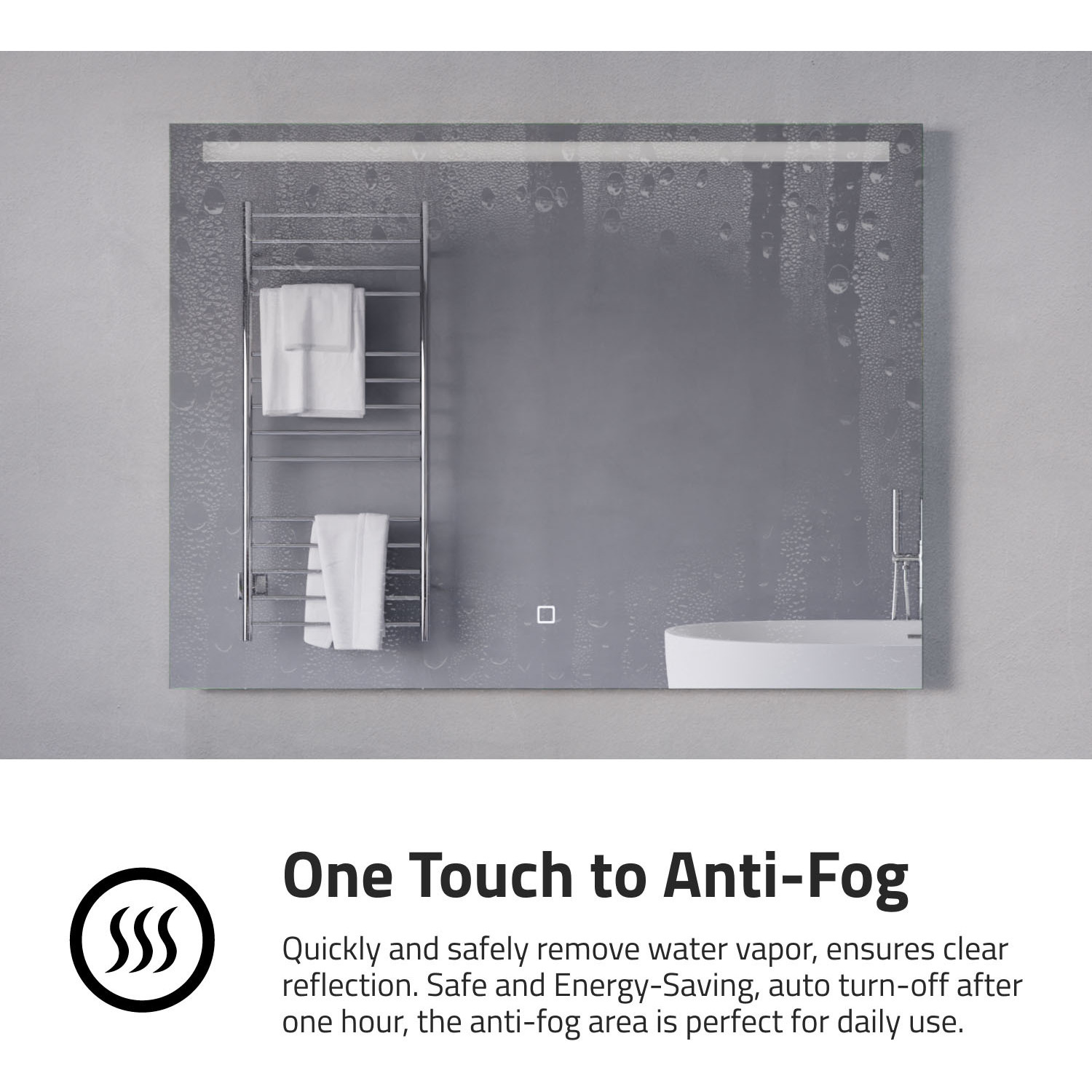 Get a crisp and clear reflection like you’ve never seen before! This mirror is copper free, so it delivers amazing visual clarity while resisting corrosion. The energy-efficient LED light strip creates a warm ambience while providing ideal illumination for doing makeup, shaving, or your favorite skin care routine. Color temperature easily adjusts to the level you prefer. A built-in defogger keeps the glass perfectly clear even after a long, hot shower — no need to wipe it down when you’re done!