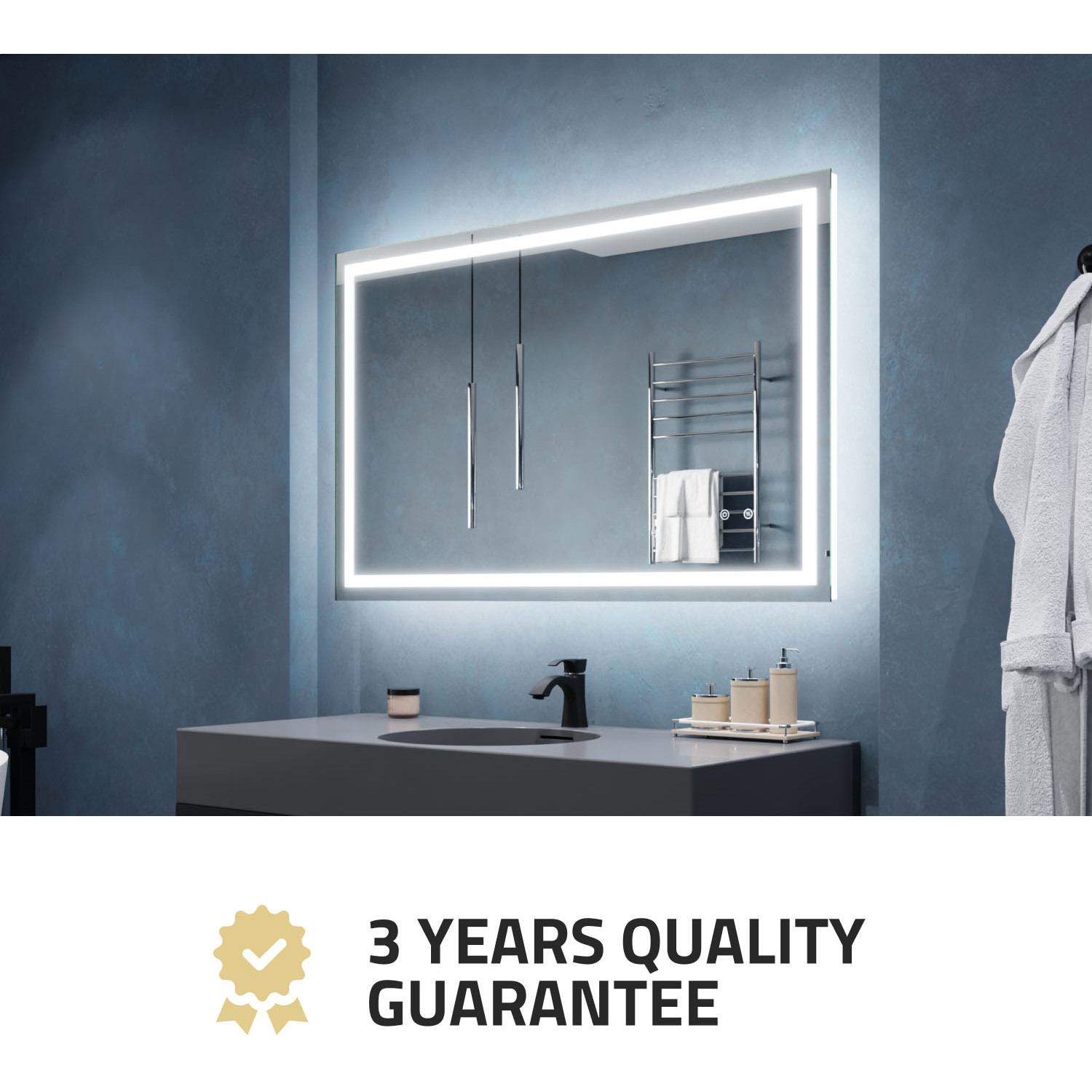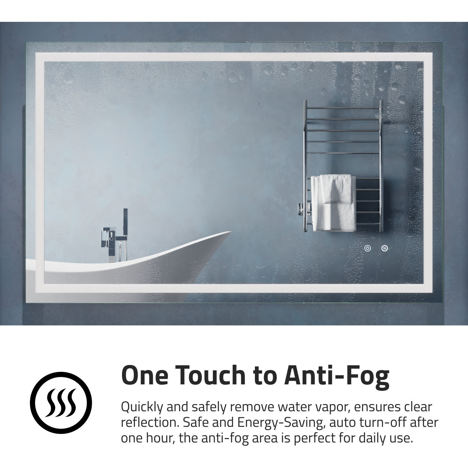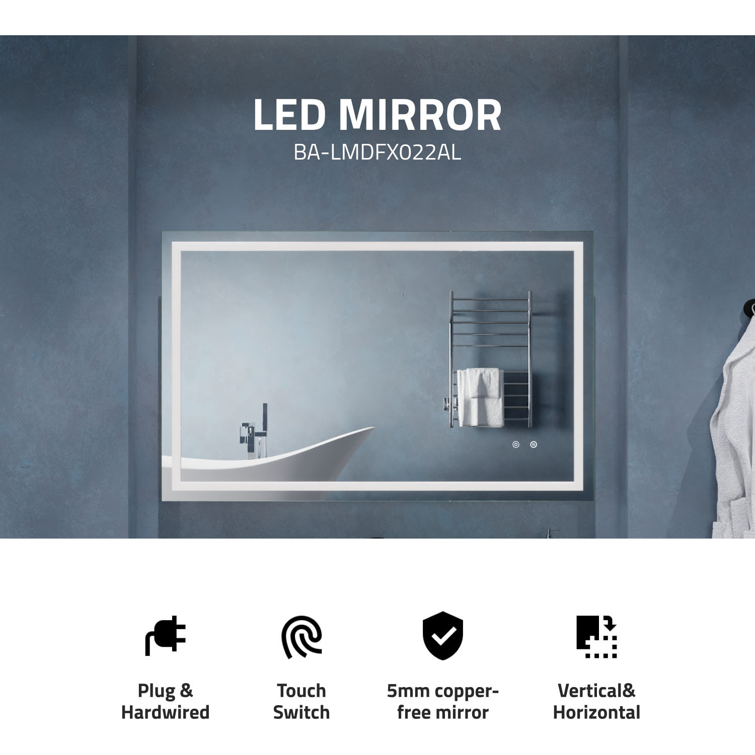 5MM RHINO-ALLOY CERTIFIED, COPPER-FREE MIRROR — resists corrosion, delivers amazing visual clarity and features a safety film backADJUSTABLE COLOR TEMPERATURE — 2700K-6500K high-output LED strip lets you choose your preferred lighting levelBUILT-IN DEFOGGER — keep your mirror free from condensation with the touch of a buttonTWO TOUCH SWITCHES — for easy on/off and feature adjustmentELECTRONICS AND LED DRIVER ARE UL-CERTIFIED — our mirrors meet all the latest safety standards5-FT. CORD WITH PLUG — simply plug into an outlet or remove the plug for hardwire installationINCLUDES EVERYTHING YOU NEED — package includes mounting hardwareIP44 Waterproof and Dustproof: Our LED mirrors are designed with a high IP44 rating, ensuring safe and environmentally friendly lighting in wet bathroom environments. Enjoy a worry-free experience with waterproof and moisture-proof backing that adds an exShatterproof and Corrosion Proof: We prioritize your safety! Our copper-free mirrors are three times more resistant to corrosion than traditional mirrors, guaranteeing a longer lifespan. The shatter-resistant coating prevents glass from spreading, reducinTop Quality and Long Endurance: Crafted from 1/5 in. (5 mm) HD environmentally friendly copper-free silver mirror, our LED mirrors offer exceptional clarity and durability. Experience top-notch quality that stands the test of time.Standard Plug/Hardwired: We offer the convenience of both standard plug and hardwired options, ensuring easy installation and compatibility with your bathroom's electrical setup. Choose the method that suits your preferences and needs.Super-Sensitive Touch Button: Experience effortless control with our super-sensitive touch button. Easily adjust the brightness or switch between lighting modes with a simple touch, adding convenience and customization to your daily routine.Enhanced Packaging and Accessories: Our newly improved packaging is designed to protect every aspect of the mirror, including the corners and both front and back sides. Rigorously tested, it has passed all dropping tests, ensuring your mirror arrives in pLIMITED 3-YEAR WARRANTY — when you buy it, we back it, so you can be confident in the quality of our products