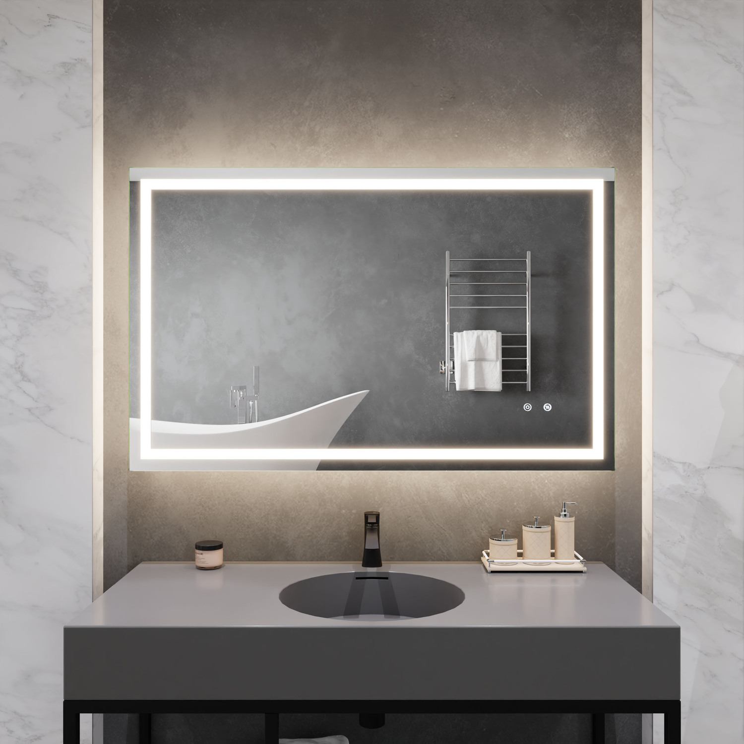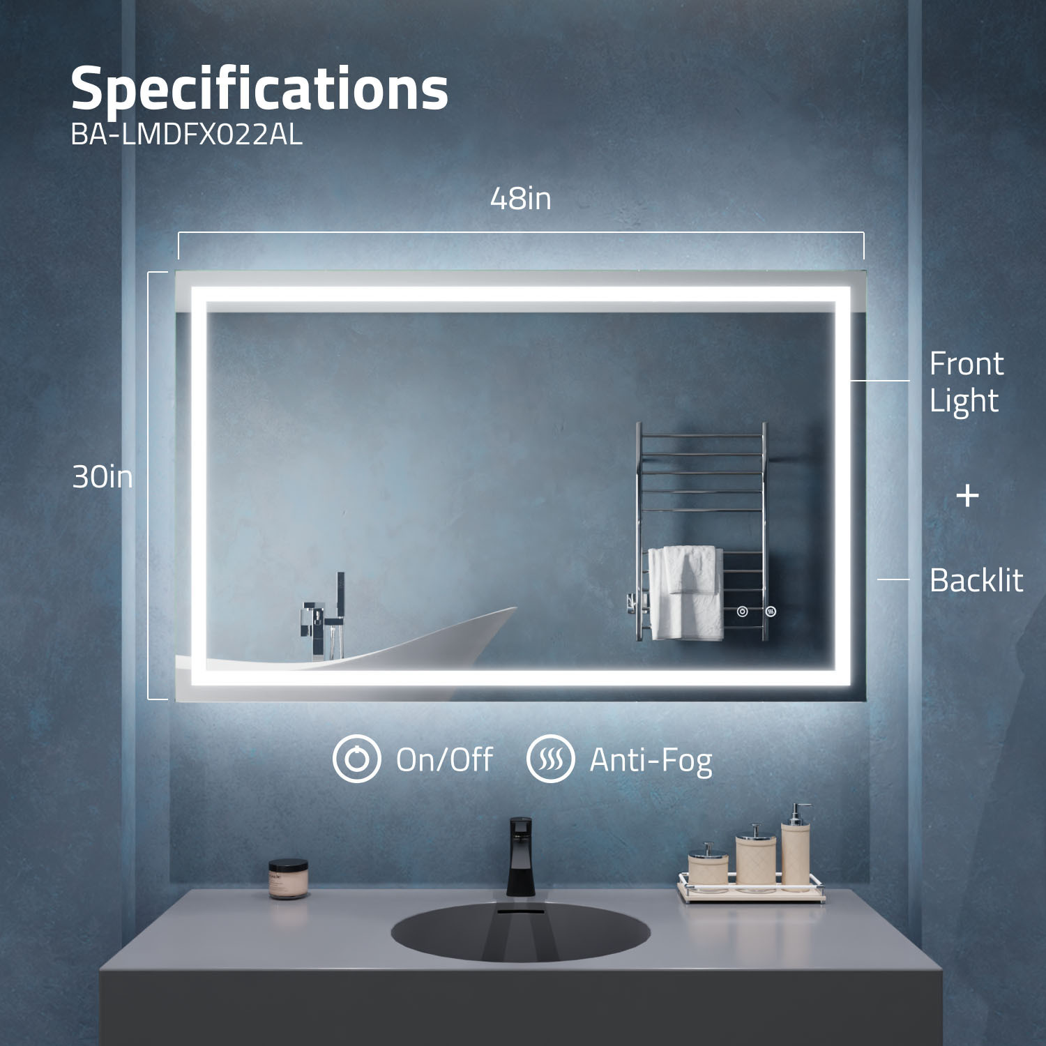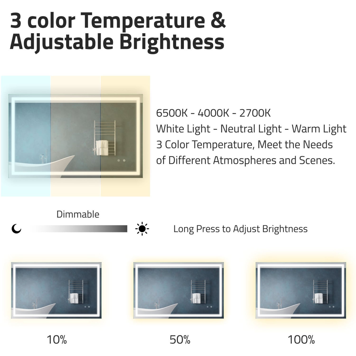 5MM RHINO-ALLOY CERTIFIED, COPPER-FREE MIRROR — resists corrosion, delivers amazing visual clarity and features a safety film backADJUSTABLE COLOR TEMPERATURE — 2700K-6500K high-output LED strip lets you choose your preferred lighting levelBUILT-IN DEFOGGER — keep your mirror free from condensation with the touch of a buttonTWO TOUCH SWITCHES — for easy on/off and feature adjustmentELECTRONICS AND LED DRIVER ARE UL-CERTIFIED — our mirrors meet all the latest safety standards5-FT. CORD WITH PLUG — simply plug into an outlet or remove the plug for hardwire installationINCLUDES EVERYTHING YOU NEED — package includes mounting hardwareIP44 Waterproof and Dustproof: Our LED mirrors are designed with a high IP44 rating, ensuring safe and environmentally friendly lighting in wet bathroom environments. Enjoy a worry-free experience with waterproof and moisture-proof backing that adds an exShatterproof and Corrosion Proof: We prioritize your safety! Our copper-free mirrors are three times more resistant to corrosion than traditional mirrors, guaranteeing a longer lifespan. The shatter-resistant coating prevents glass from spreading, reducinTop Quality and Long Endurance: Crafted from 1/5 in. (5 mm) HD environmentally friendly copper-free silver mirror, our LED mirrors offer exceptional clarity and durability. Experience top-notch quality that stands the test of time.Standard Plug/Hardwired: We offer the convenience of both standard plug and hardwired options, ensuring easy installation and compatibility with your bathroom's electrical setup. Choose the method that suits your preferences and needs.Super-Sensitive Touch Button: Experience effortless control with our super-sensitive touch button. Easily adjust the brightness or switch between lighting modes with a simple touch, adding convenience and customization to your daily routine.Enhanced Packaging and Accessories: Our newly improved packaging is designed to protect every aspect of the mirror, including the corners and both front and back sides. Rigorously tested, it has passed all dropping tests, ensuring your mirror arrives in pLIMITED 3-YEAR WARRANTY — when you buy it, we back it, so you can be confident in the quality of our products