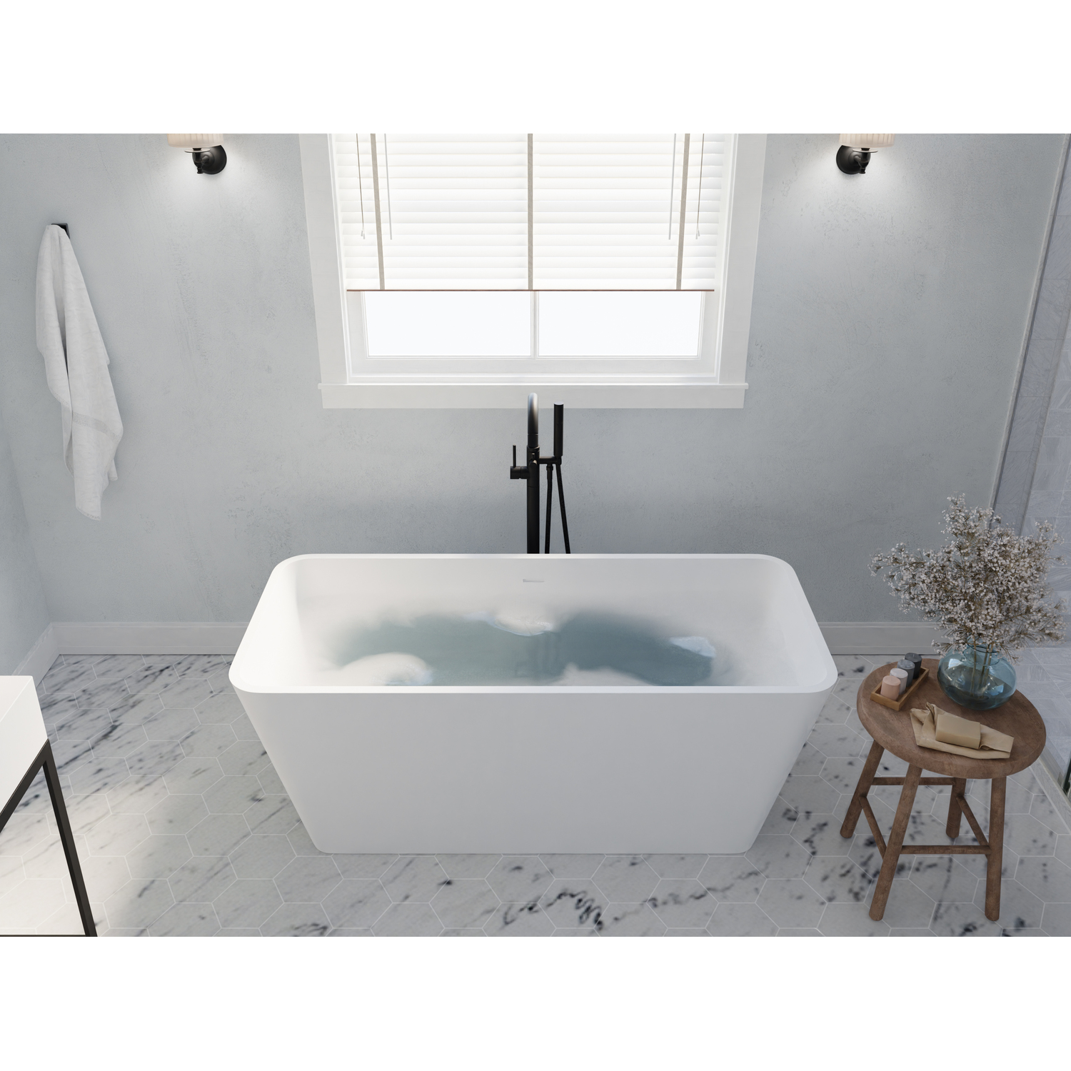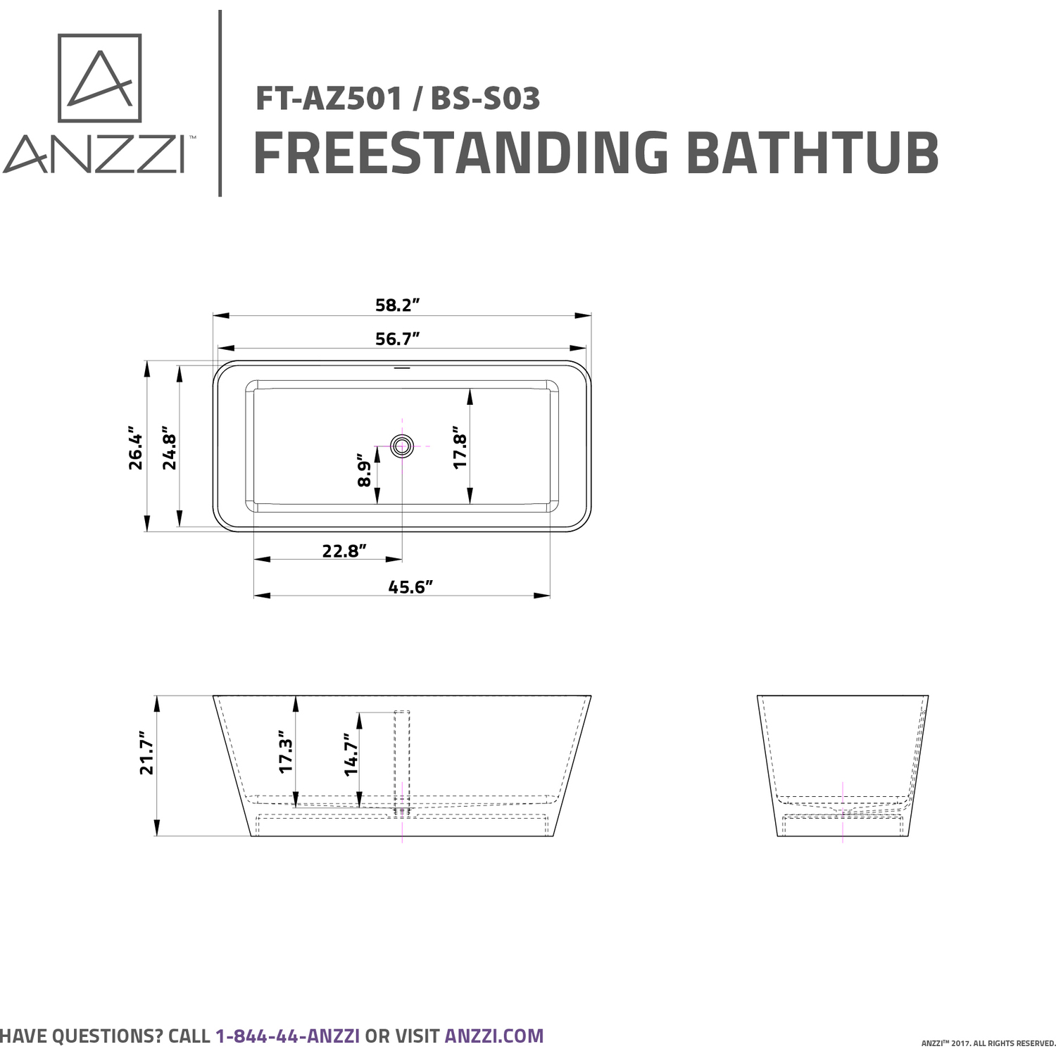 Bring an oasis home with our ANZZI Fomaia artificial stone freestanding soaking bathtub. Ergonomically rectangular designed to cradle the body's form for maximum comfort this tub is styled with a classic and contemporary flair. Relax and drift away while submerged in your personal spa pool.One Piece Man Made ANZZI Stone in White MatteDesigned for floor or wall mounted filler spoutBuilt-in Chrome Overflow and Push Operated Center DrainRHINO ALLOY certifiedDimensions 58.25 in. L x 26.4 in. W x 21.5 in. HSoaking Depth 16 inWater Capacity 82 gallonsTub Weight 330 lbs.Already pre-plumbed for easy and straight forward installationShips from factory within 24 hours once order is processedLifetime WarrantyTo speak to a knowledgeable and dedicated ANZZI specialist simply call 1-844-44-ANZZI or visit us on the web at www.ANZZI.com