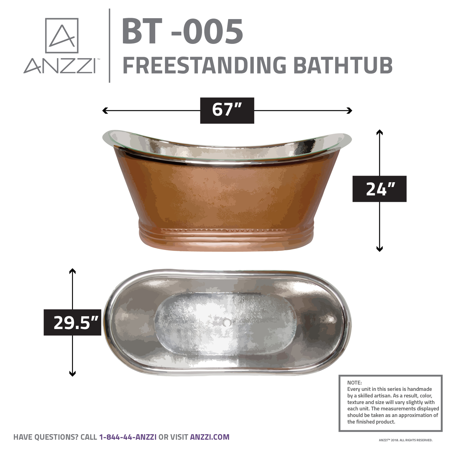 ANZZI presents the latest trending in modern antique Ionian series soaking freestanding bathtub. Each Ionian full soak tub is hand crafted using Rhino Alloy certified artisan copper. Enjoy a reinvigorating and deeply soothing soak in this elegantly stylish freestanding bathtub. Become a member of the ANZZI family and experience why Perfection is our Tradition.Massive 67" length with a spacious 19" deep interiorShips within 24 hours of order processingEvery piece is fully handmade from start to finishCrafted using RHINO ALLOY certified copperLimited lifetime warranty from manufacturer defectsHandmade process will result in subtle variations in color, shape and finishPush drain includedOne piece constructionTo speak to a knowledgeable and dedicated ANZZI specialist simply call 1-844-44-ANZZI or visit us on the web at www.ANZZI.com