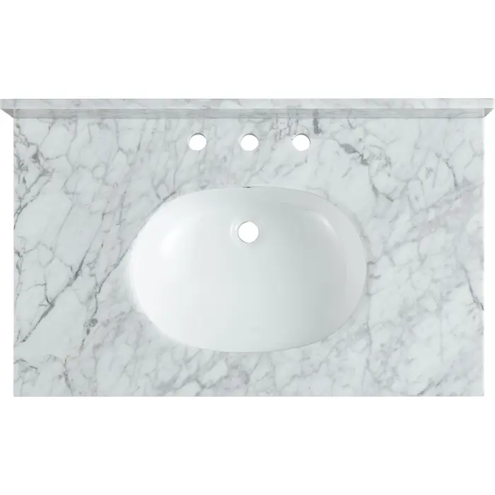 - Scratch-resistant Carrara White stone counter top features built-in backsplash
