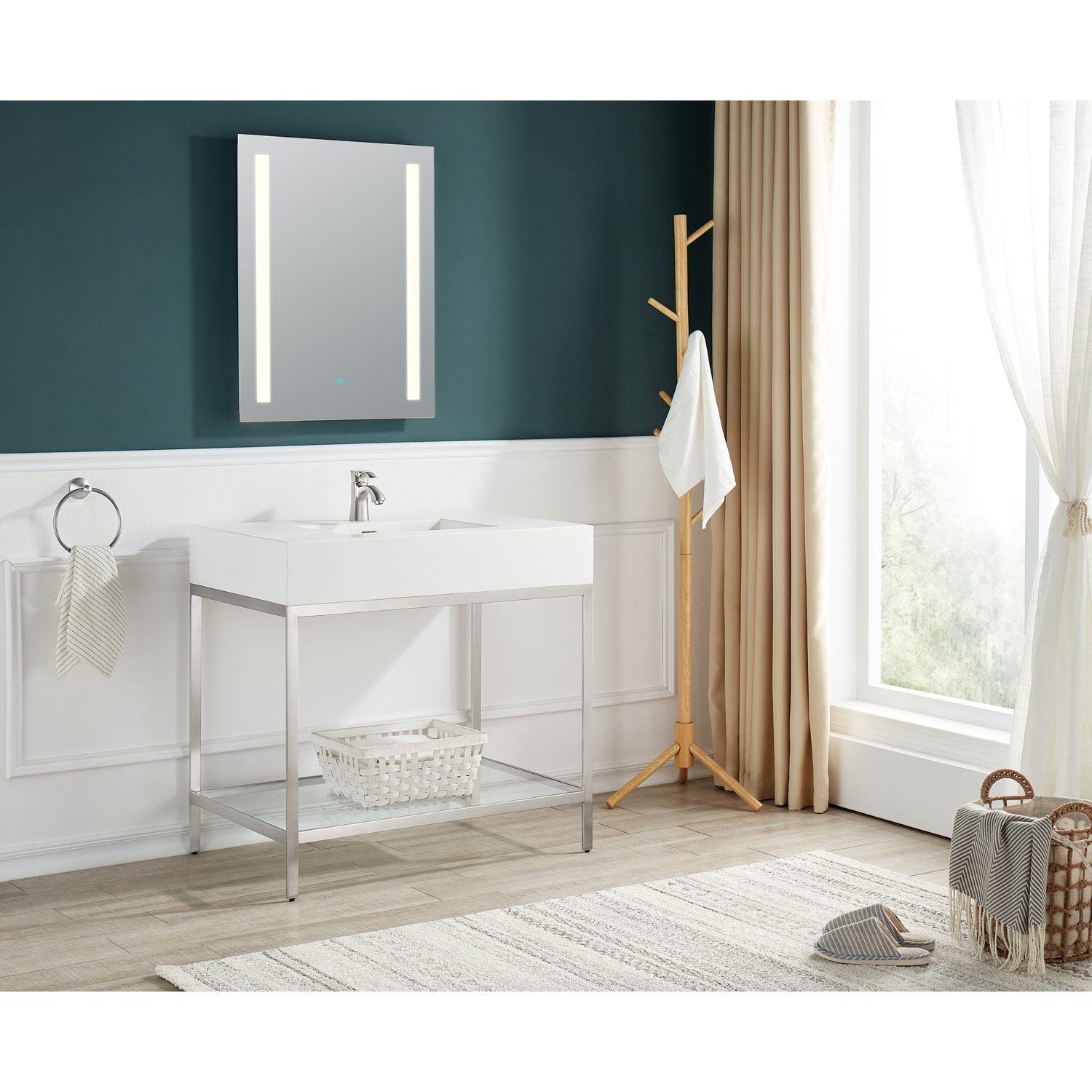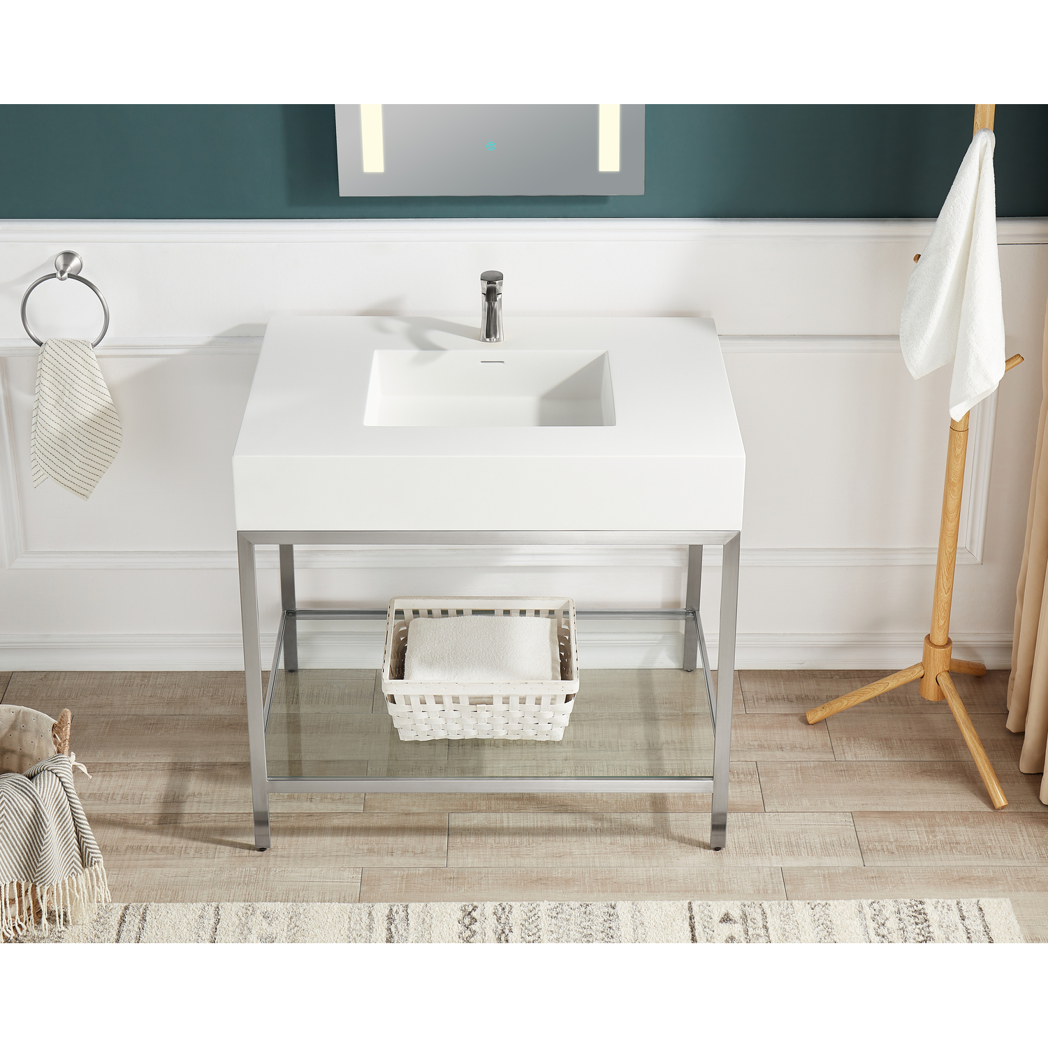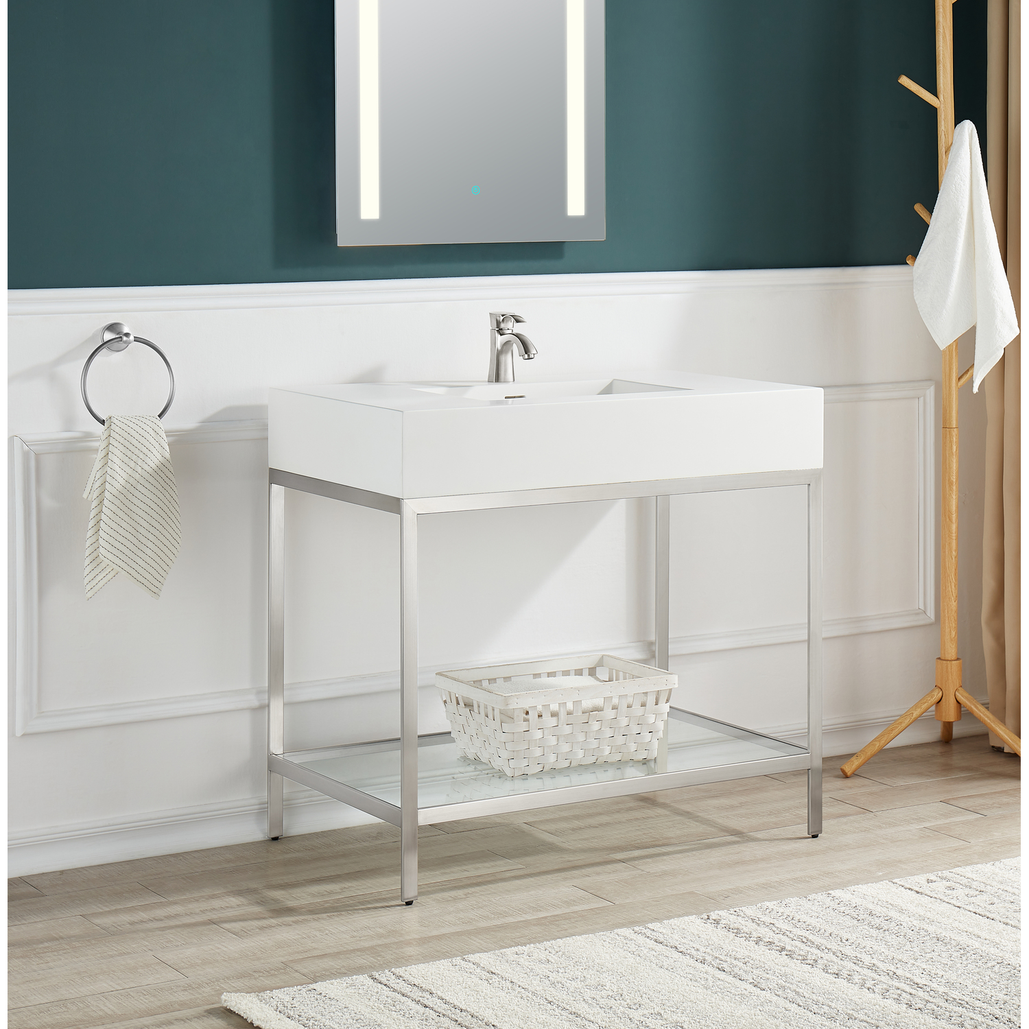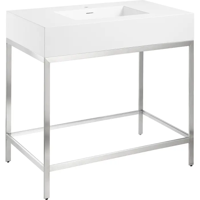 The ultramodern design of our Ventura console sink delivers a maximum style upgrade with a minimalist footprint. The rust-resistant stainless steel frame is finished in a striking Brushed Nickel, while the sturdy Matte White gel-coated resin counter top and sink will provide years of faithful service without losing their luster. A tempered glass bottom panel completes the package by creating a handy space for your favorite accessories.Includes counter top sink, frame and mounting hardwareDurable Matte White counter top is crafted from gel-coated resin for long lifeRust-resistant stainless steel frame is finished in striking Brushed NickelConsole dimensions: 36 in. W x 28 in. H x 22 in. DCounter top dimensions: 36 in. W x 6 in. H x 22 in. DSink dimensions: 18.1 in. W x 11.8 in. DProtected by our Limited Lifetime WarrantyGet it fast — ships from warehouse within 24 hours of order processingSafe and convenient curbside deliveryWater supply kit and drain not includedLED Mirror shown is BA-LMDFV002WH, 30 in. H x 24 in. W LED Mirror with easy touch dimmer and defogger, sold separatelyFaucet shown is L-AZ012BN, Alto series single-hole faucet in Brushed Nickel, sold separatelyAlso available in Brushed Gold, model number CS-FGC001-BG, and Matte Black, model number CS-FGC001-MBTo speak to a knowledgeable and dedicated ANZZI specialist simply call 1-844-44-ANZZI or visit us on the web at www.ANZZI.com