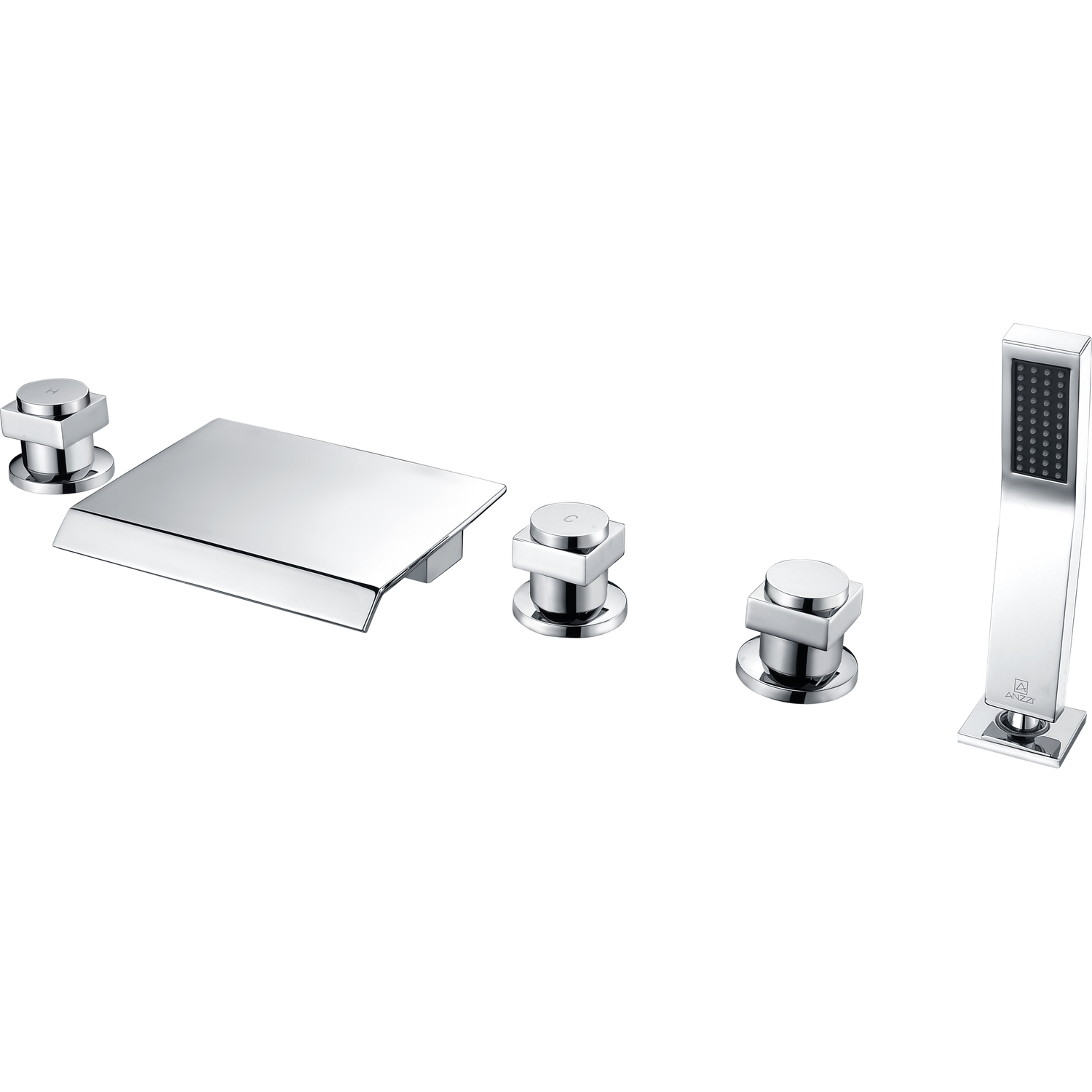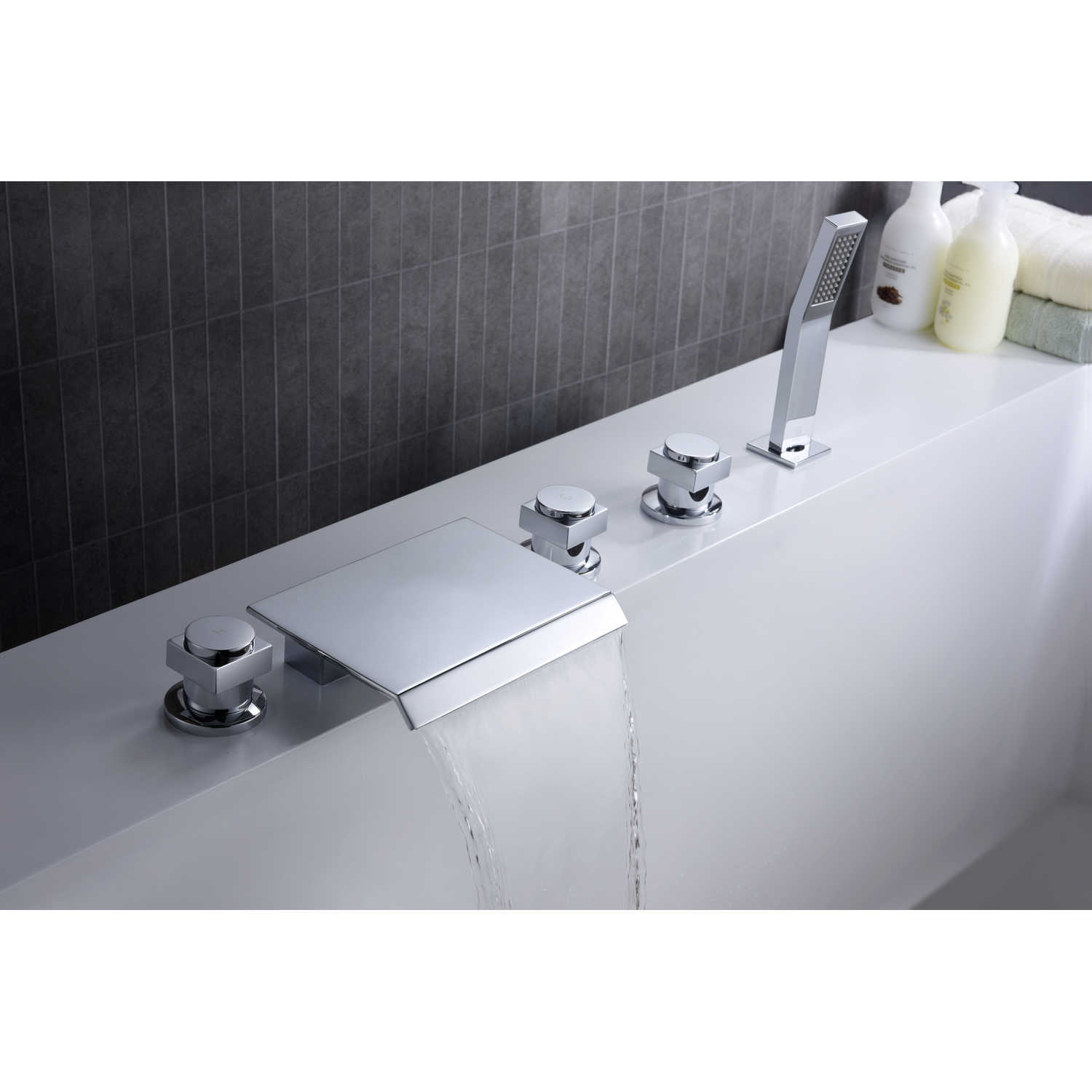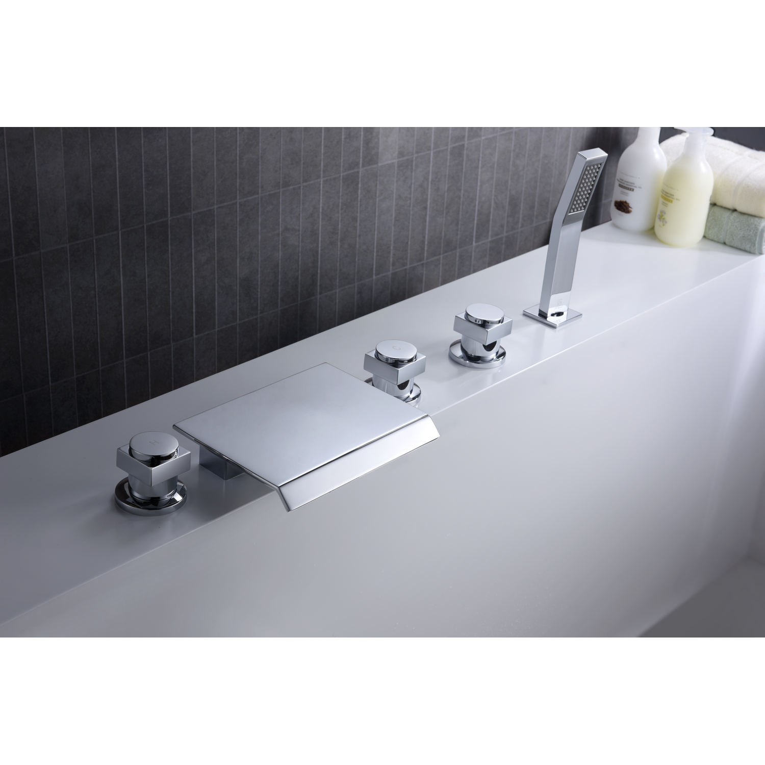 High performance excellence has arrived in the form of ANZZI's Guaira series roman bathtub faucet set. Crafted with a sleek contemporary flair this modern cascading waterfall faucet will lend an heir of class to any bathtub and bathroom setting. The solid full brass interior plumbing and rough-in valve's performance is outmatched only the lustrous polished chrome steel casing. ANZZI provides everything you'll need to transform the everyday bathroom into a private oasis of soothing luxury.Five (5) piece, triple handle, widespread deck mounted roman faucetElegant tub filling cascading waterfall spoutFar reaching extendable euro-grip handheld sprayerRHINO ALLOY certified steel exterior in a lustrous Chrome finish housing a solid brass interiorTwo (2) half (.5)" connection size supply lines includedOverall dimensions: 1.77 in. H x 23.62 in. L x 7.87 in. W1.8 in. spout height and 4.3 in. spout reachShips from factory within 24 hours of orderLifetime WarrantyTo speak to a knowledgeable and dedicated ANZZI specialist simply call 1-844-44-ANZZI or visit us on the web at www.ANZZI.com
