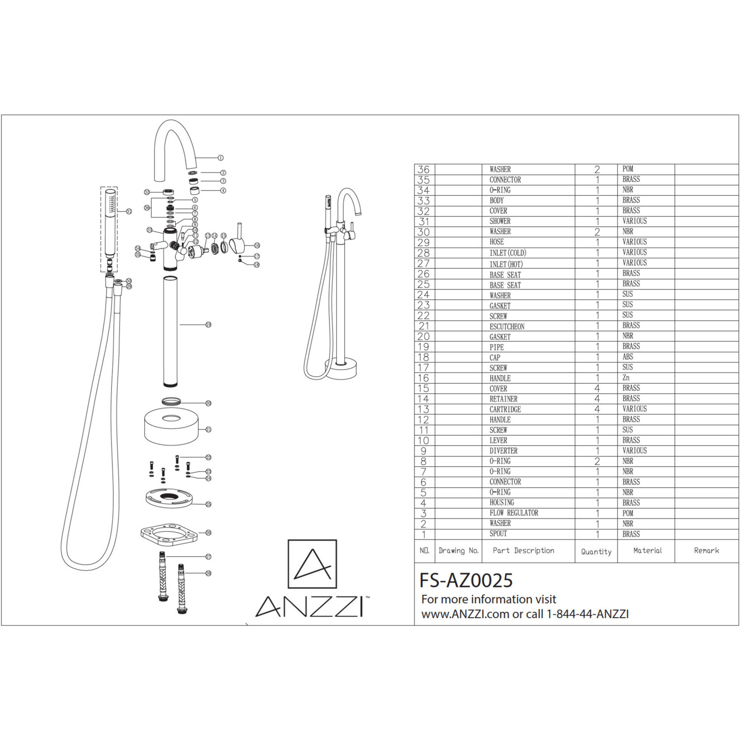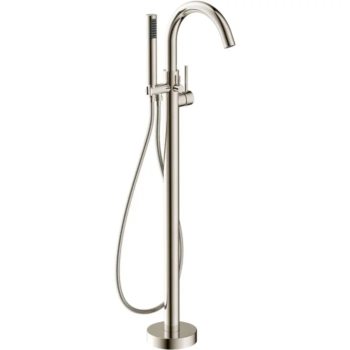 The ANZZI Coral Series 2-handle freestanding claw foot tub faucet with hand shower will add a classic appeal to any freestanding bathtub. Elegantly featuring a swan-like high arched spout, a single handle water lever (controls water temperature and flow), a diverter, and pull out circular hand sprayer. This floor mounted tub faucet is crafted for durability and is RHINO ALLOY certified.One (1) Piece Freestanding Claw Foot Tub Faucet with Hand shower in Brushed Nickel FinishTwo (2) Handle Lever DesignOne (1) Handheld SprayerFloor Mounted, Single Hole InstallationEverlasting Solid Brass Valves.5 in Supply ConnectionOverall Dimensions 46 in (H) x 8 in (L) x 6.3 in (W)36 in Spout Height with a 9 in reachHand Sprayer Hose Length – 60 inAssembled Weight 13 lbs.Lever handles are ADA compliant for ease of operationCrafted using RHINO ALLOY Certified SteelLifetime WarrantyTo speak to a knowledgeable and dedicated ANZZI specialist simply call 1-844-44-ANZZI or visit us on the web at www.ANZZI.com