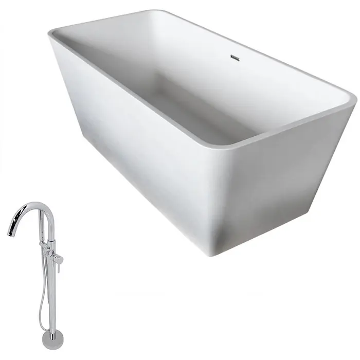 Bring an oasis home with our ANZZI Cenere Solid Surface freestanding soaking bathtub. Ergonomically rectangular designed to cradle the body's form for maximum comfort this tub is styled with a classic and contemporary flair. Relax and drift away while submerged in your personal spa pool. Paired with the luxurious ANZZI Kros freestanding faucet you are sure to have a relaxing soak.1-piece man-made ANZZI stone in white matteIncludes ANZZI Kros freestanding faucet FS-AZ0025CHDesigned for floor or wall mounted filler spoutBuilt-in chrome overflow and push operated center drainDimensions 27 in L x 60 in W x 23 in HSoaking Depth 16 inWater Capacity 82 gallonsTub Weight 330 lbs.Already pre-plumbed for easy and straight forward installationShips from factory within 24 hours once order is processedLifetime WarrantyTo speak to a knowledgeable and dedicated ANZZI specialist simply call 1-844-44-ANZZI or visit us on the web at www.ANZZI.com