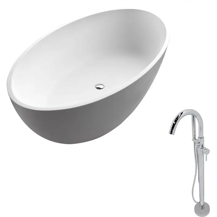 Bring an oasis home with our ANZZI Cestino Solid Surface freestanding soaking bathtub. Ergonomically oval designed to cradle the body's form for maximum comfort this tub is styled with a classic and contemporary flair. Relax and drift away while submerged in your personal spa pool. Paired with the luxurious ANZZI Kros freestanding faucet you are sure to have a relaxing soak.1-piece man-made ANZZI stone in white matteIncludes ANZZI Kros freestanding faucet FS-AZ0025CHDesigned for floor or wall mounted filler spoutBuilt-in chrome overflow and push operated center drainDimensions 37 in. L x 67 in. W x 22 in. HSoaking Depth 13.9 inWater Capacity 74 gallonsTub Weight 418 lbs.Already pre-plumbed for easy and straight forward installationShips from factory within 24 hours once order is processedLifetime WarrantyTo speak to a knowledgeable and dedicated ANZZI specialist simply call 1-844-44-ANZZI or visit us on the web at www.ANZZI.com