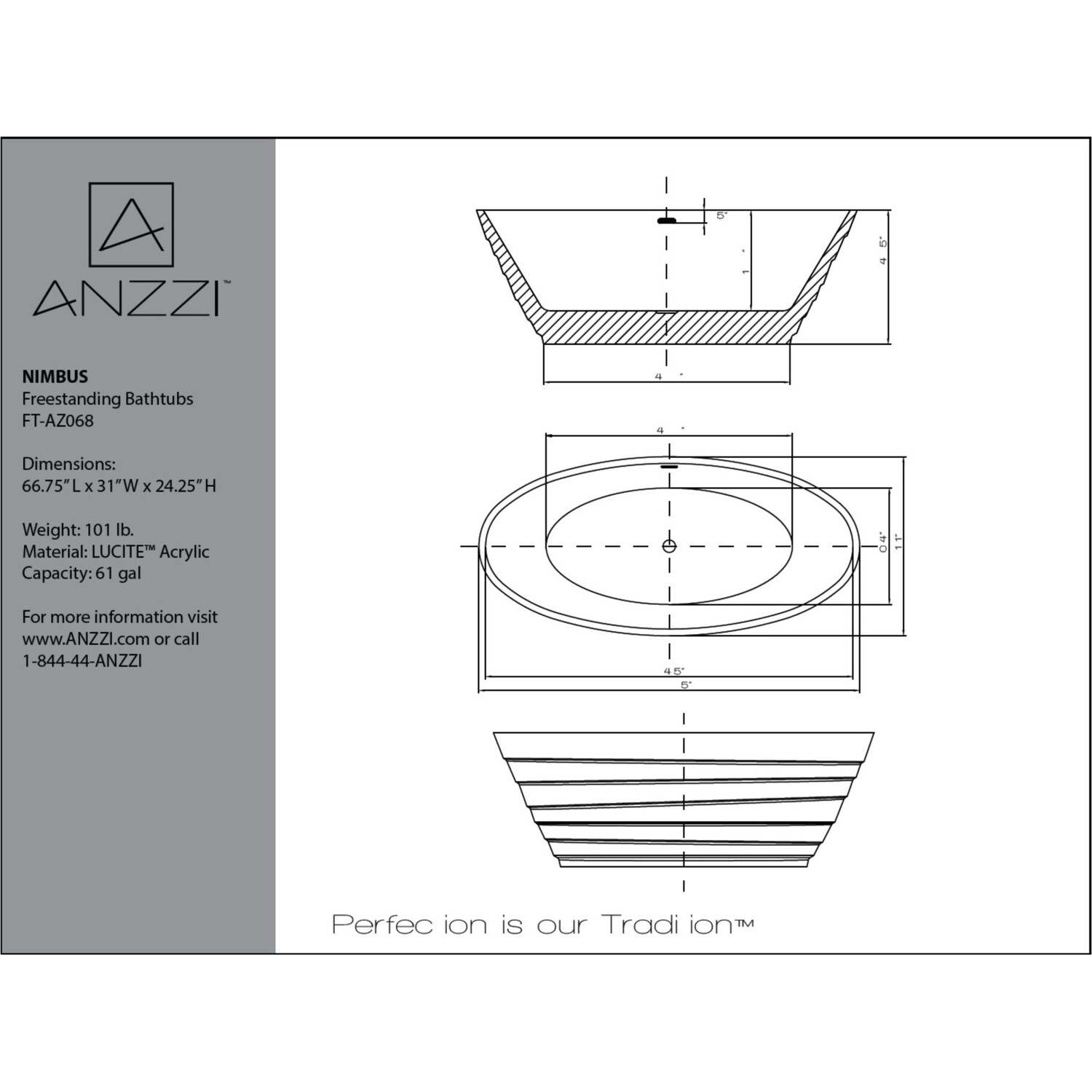 Transcend into happiness by stepping into our ANZZI Nimbus one piece acrylic freestanding soaking bathtub in glossy white. Your euphoric state will be enhanced as you soak away in this ergonomic and delicately crafted curvaceous tub made of glossy white high yield acrylic with marine grade fiberglass re-enforcement. With chrome accents this sophisticated and timeless soaking tub will effortlessly compliment any bathroom décor. Exhilarate your end-of-day deep soak!Free Standing Soaking BathtubOne (1) Piece Acrylic in High Gloss White FinishBuilt-in Overflow and Center DrainRHINO ALLOY certified stainless steel support frameAdjustable Frame Leveling FeetOne (1) Person CapacityDimensions 66.75 in L x 31 in W x 24.5 in HSoaking Depth 14.75 inTub Weight 101 lbs.Already pre-plumbed for easy and straight forward installationShips from factory within 24 hours of orderLifetime WarrantyTo speak to a knowledgeable and dedicated ANZZI specialist simply call 1-844-44-ANZZI or visit us on the web at www.ANZZI.com