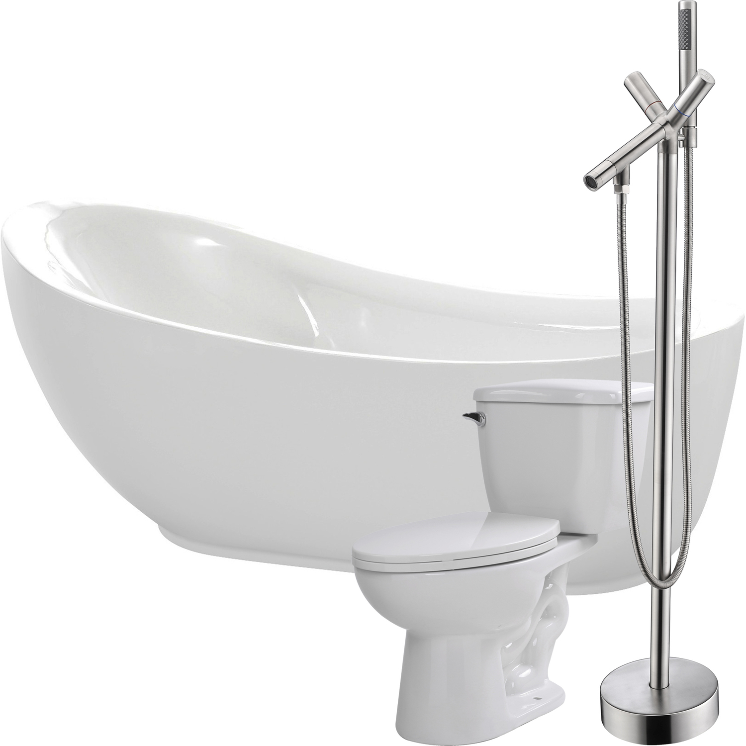 Bring an oasis home with our ANZZI Talyah soaking bathtub crafted in white marine grade acrylic with high yield fiberglass reinforcement. Ergonomically designed to cradle the body's form for maximum comfort this tub is styled with a classic and contemporary flair. Relax and drift away while submerged in your personal oasis.One piece acrylic bathtub in glossy whiteBuilt in overflow with included pop up drain in chromeBathtub water capacity: 52.31 gallonsBathtub dimensions: 71 in. L x 35 in. W x 30 in. HBathtub soaking depth: 18 in.Two (2) handle; single (1) hole faucet in a brushed nickel finishFaucet spout height: 31.5 in.; spout reach: 8.3 in.; flow rate: 2.5 gpmFaucet includes matching handheld sprayerTwo (2) piece vitreous china in whiteSoft closing elongated seat and cover includedWatersense certified 1.28 gpf flush rate; 12 in. rough-inTo speak to a knowledgeable and dedicated ANZZI specialist simply call 1-844-44-ANZZI or visit us on the web at www.ANZZI.com