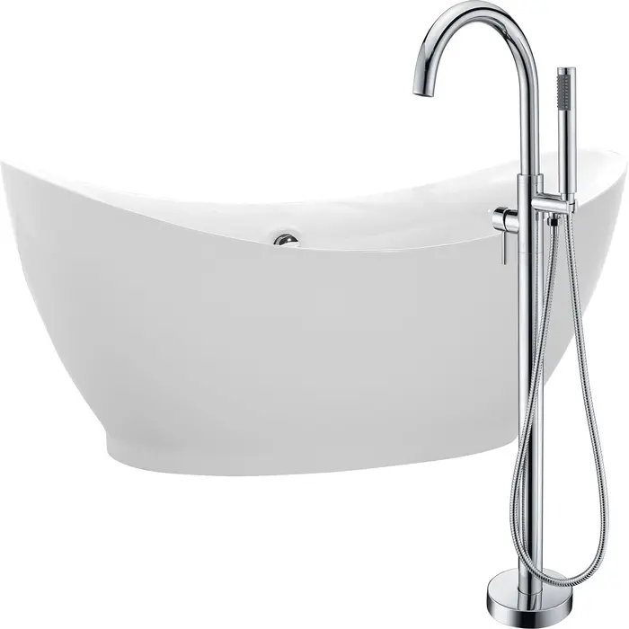 Bring an oasis home with our ANZZI Reginald soaking bathtub crafted in white marine grade acrylic with high yield fiberglass reinforcement. Ergonomically designed to cradle the body's form for maximum comfort this tub is styled with a classic and contemporary flair. Relax and drift away while submerged in your personal oasis.One piece acrylic bathtub in glossy whiteBuilt in overflow with included pop up drain in chromeBathtub water capacity: 47.55 gallonsBathtub dimensions: 68 in. L x 31 in. W x 31.5 in. HBathtub soaking depth: 18 in.Two (2) handle; single (1) hole faucet in a polished chrome finishFaucet spout height: 36 in.; spout reach: 9 in.; flow rate: 2.5 gpmFaucet includes matching handheld sprayerShips from factory within 24 hours once order is processedLimited lifetime warrantyTo speak to a knowledgeable and dedicated ANZZI specialist simply call 1-844-44-ANZZI or visit us on the web at www.ANZZI.com