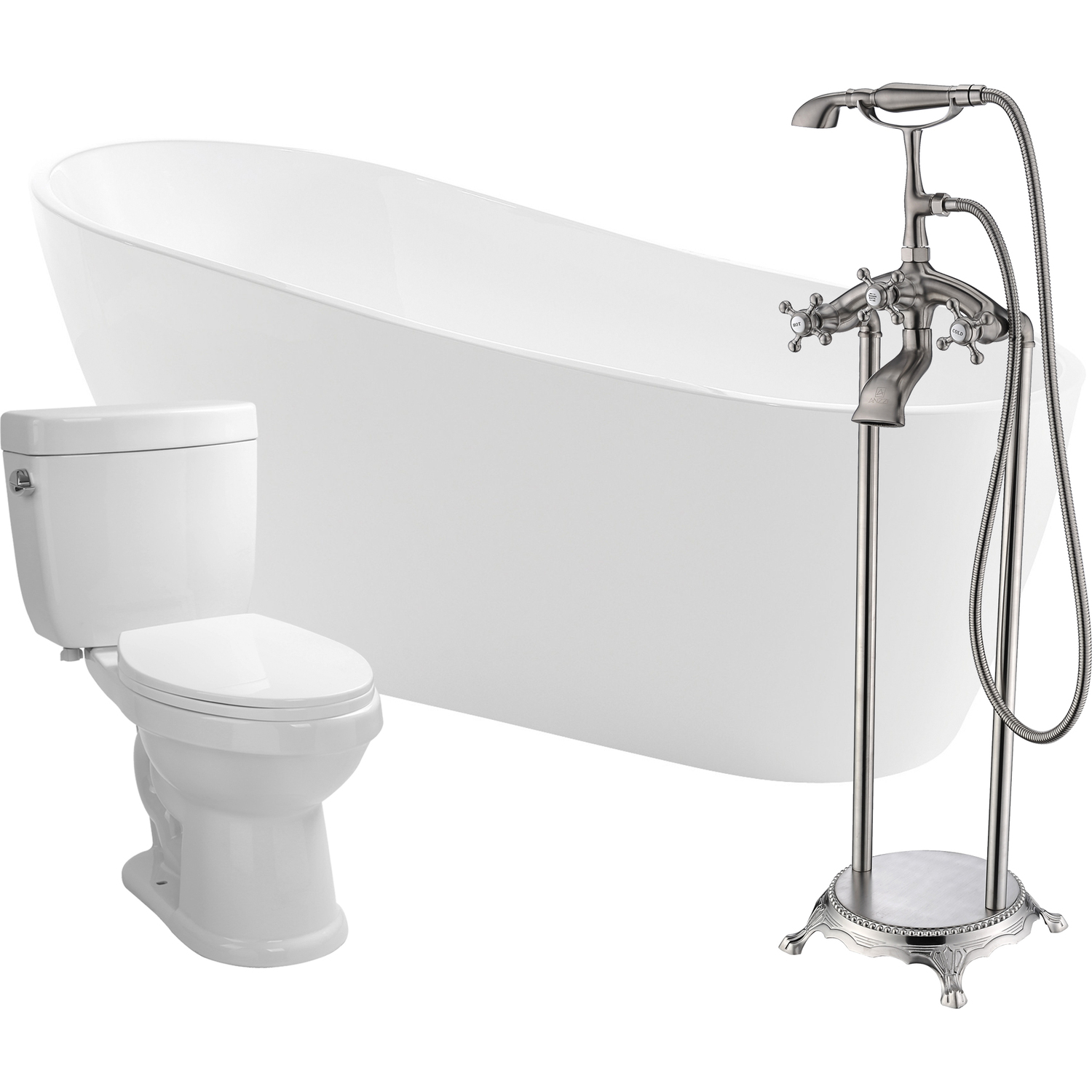 Bring an oasis home with our ANZZI Trend soaking bathtub crafted in white marine grade acrylic with high yield fiberglass reinforcement. Ergonomically designed to cradle the body's form for maximum comfort this tub is styled with a classic and contemporary flair. Relax and drift away while submerged in your personal oasis.One piece acrylic bathtub in glossy whiteBuilt in overflow with included pop up drain in chromeBathtub water capacity: 79.26 gallonsBathtub dimensions: 67 in. L x 31.5 in. W x 28.3 in. HBathtub soaking depth: 17.7 in.Three (3) handle; single (1) hole faucet in a brushed nickel finishFaucet spout height: 23.62 in.; spout reach: 6.3 in.; flow rate: 5.1 gpmFaucet includes matching handheld sprayerTwo (2) piece vitreous china in whiteSoft closing elongated seat and cover included1.6 gpf flush rate; 12 in. rough-inTo speak to a knowledgeable and dedicated ANZZI specialist simply call 1-844-44-ANZZI or visit us on the web at www.ANZZI.com