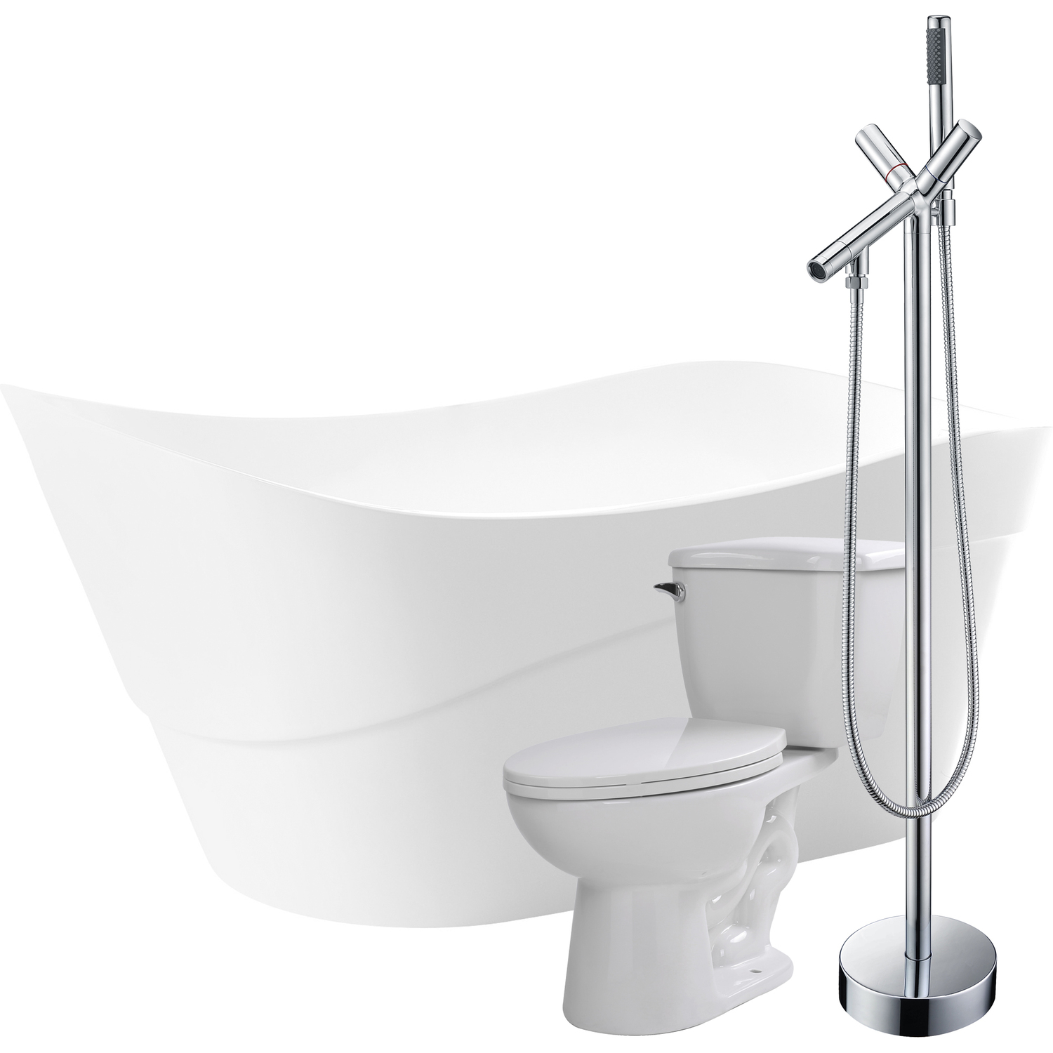 Bring an oasis home with our ANZZI Kahl soaking bathtub crafted in white marine grade acrylic with high yield fiberglass reinforcement. Ergonomically designed to cradle the body's form for maximum comfort this tub is styled with a classic and contemporary flair. Relax and drift away while submerged in your personal oasis.One piece acrylic bathtub in glossy whiteBuilt in overflow with included pop up drain in chromeBathtub water capacity: 81.9 gallonsBathtub dimensions: 67 in. L x 31.5 in. W x 28 in. HBathtub soaking depth: 18.5 in.Two (2) handle; single (1) hole faucet in a polished chrome finishFaucet spout height: 31.5 in.; spout reach: 8.3 in.; flow rate: 2.5 gpmFaucet includes matching handheld sprayerTwo (2) piece vitreous china in whiteSoft closing elongated seat and cover includedWatersense certified 1.28 gpf flush rate; 12 in. rough-inTo speak to a knowledgeable and dedicated ANZZI specialist simply call 1-844-44-ANZZI or visit us on the web at www.ANZZI.com