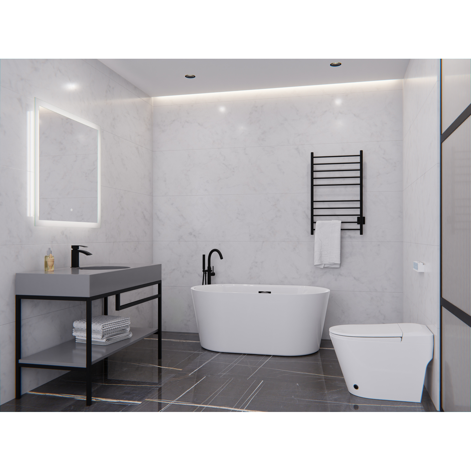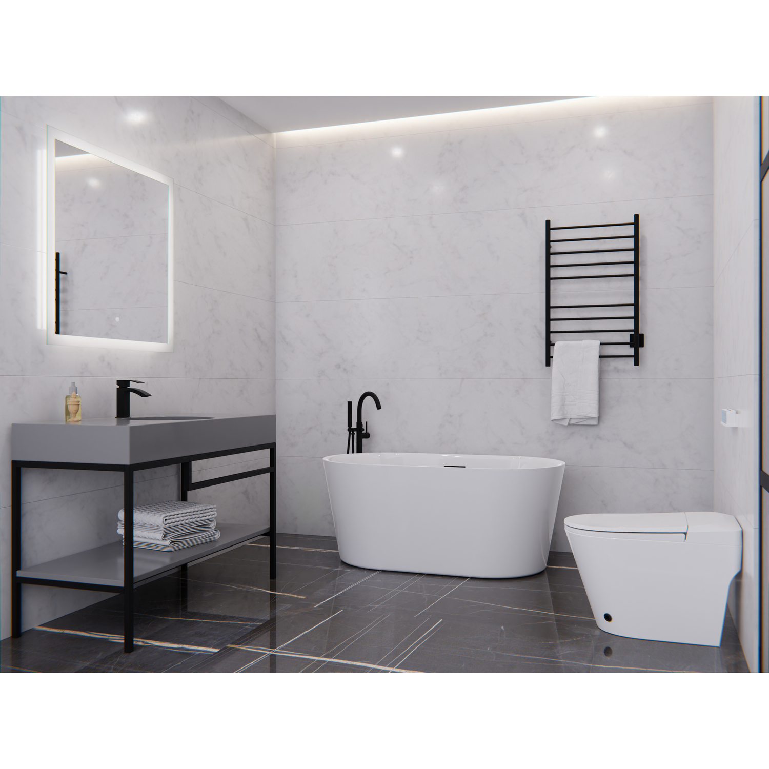- ALSO AVAILABLE FOR PURCHASE (Search #) : Mirror (BA-LMDFX004AL), Vanity (CS-FGC002-MB), Faucet (L-AZ037MB), Freestanding Faucet (FS-AZ0047MB), Towel Warmer (TW-WM104MB), Toilet (TL-STFF950WH)