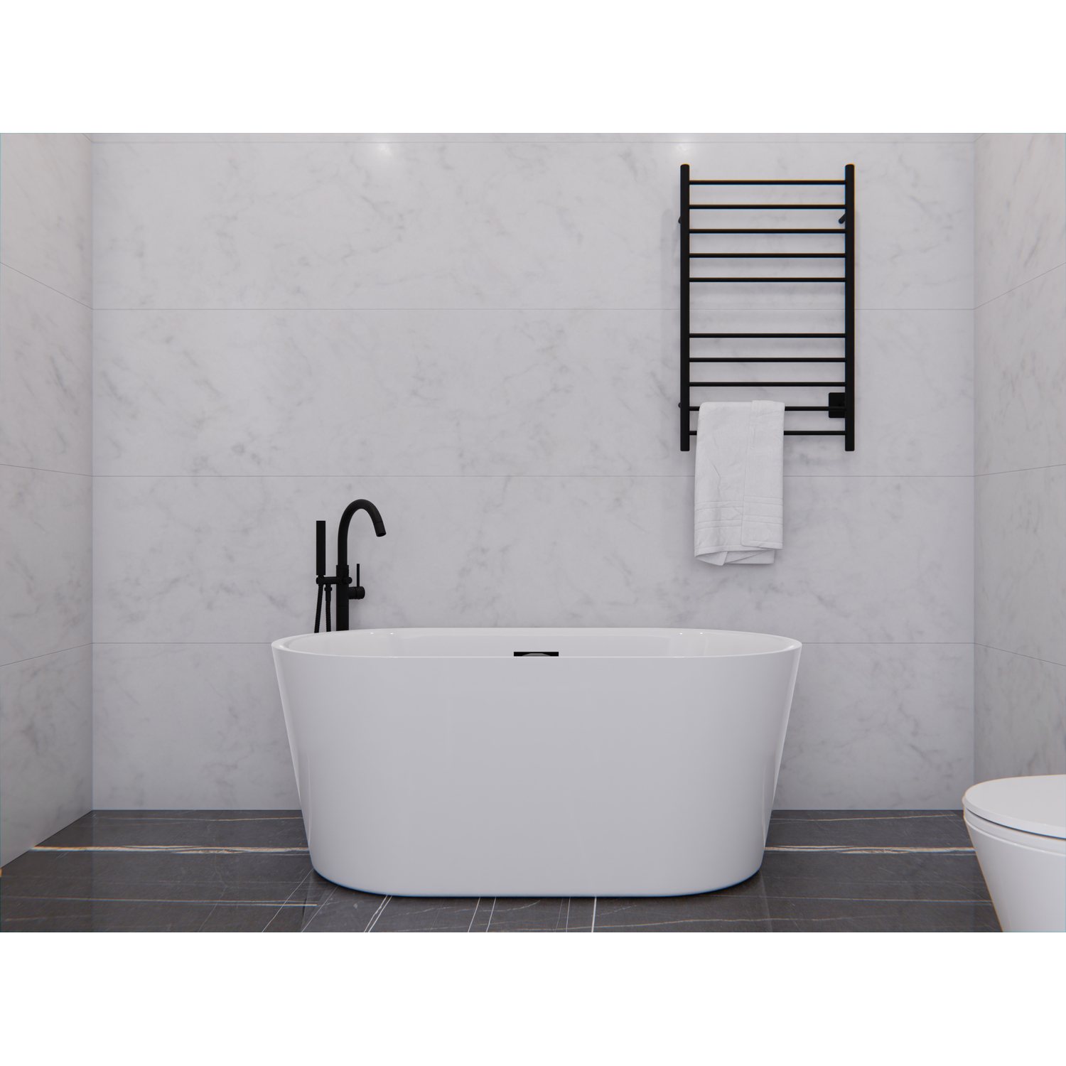 Like what you see? You can make this bathroom suite a reality with ANZZIALSO AVAILABLE FOR PURCHASE (Search #) : Mirror (BA-LMDFX004AL), Vanity (CS-FGC002-MB), Faucet (L-AZ037MB), Freestanding Faucet (FS-AZ0047MB), Towel Warmer (TW-WM104MB), Toilet (TL-STFF950WH)Strong and durable one-piece marine grade acrylic constructionGorgeous high gloss White finishBuilt-in chrome overflow and push-operated center drainRhino Alloy-certified to meet the highest quality standardsPre-plumbed for simple, straightforward installationDIMENSIONS: 59.06 in. L x 29.53 in. W x 22.83 in. HSITTING AREA: 41.73 in. x 21.6 in.SOAKING DEPTH: 13.98 in.WATER CAPACITY: 79 galProtected by our Lifetime WarrantyPairs perfectly with any ANZZI freestanding faucet (we recommended the FS-AZ0047CH)Get it fast — ships from warehouse within 24 hours of order processing