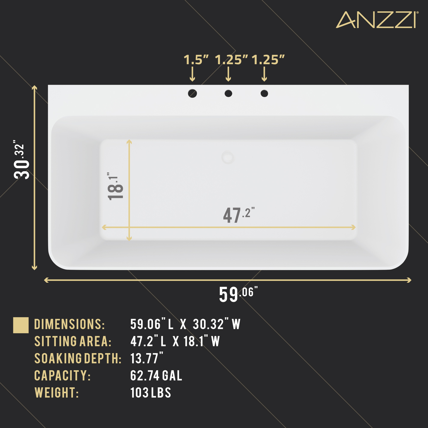NEED A FAUCET? — search FT-AZ114-5973CHSTURDY ONE-PIECE CONSTRUCTION — built from durable acrylic so you can be confident it will stand the test of timePRE-DRILLED FAUCET HOLES — 1.5 in., 1.25 in., 1.25 in. faucet holes; faucet sold separatelyBUILT-IN OVERFLOW & SIDE DRAIN — your tub is ready to install right out of the boxPRE-PLUMBED WITH ADJUSTABLE LEVELING FEET—ANZZI products are designed to make installation simpleRHINO-ALLOY CERTIFIED — we made sure your tub meets the highest quality standardsULTRA MODERN DESIGN — sleek, contemporary styling, highlighted by crisp angles and smooth linesSTRIKING WHITE FINISH — looks gorgeous year after yearDIMENSIONS — 59.05 in. L x 30.31 in. W x 22.24 in. HSOAKING DEPTH — 13.77 in.WATER CAPACITY — 62.74 gallonsTUB WEIGHT — 103.62 lbs.LIMITED LIFETIME WARRANTY — when you buy it, we back it, so you can be confident in the quality of our productsGET IT FAST — ships from warehouse within 24 hours of order processing