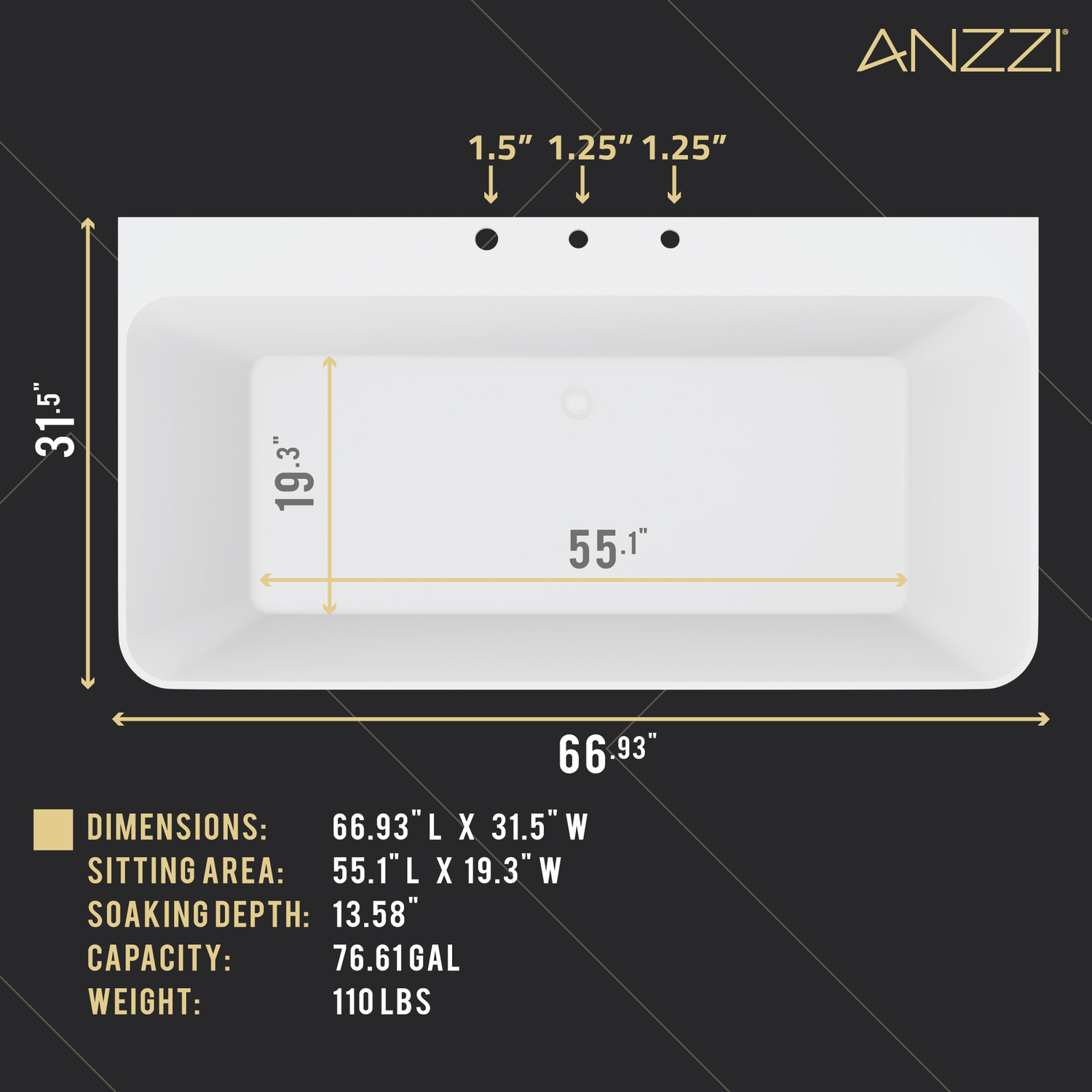 NEED A FAUCET? — search FT-AZ114-6773CHSTURDY ONE-PIECE CONSTRUCTION — built from durable acrylic so you can be confident it will stand the test of timePRE-DRILLED FAUCET HOLES — 1.5 in., 1.25 in., 1.25 in. faucet holes; faucet sold separatelyBUILT-IN OVERFLOW & SIDE DRAIN — your tub is ready to install right out of the boxPRE-PLUMBED WITH ADJUSTABLE LEVELING FEET—ANZZI products are designed to make installation simpleRHINO-ALLOY CERTIFIED — we made sure your tub meets the highest quality standardsULTRA MODERN DESIGN — sleek, contemporary styling, highlighted by crisp angles and smooth linesSTRIKING WHITE FINISH — looks gorgeous year after yearDIMENSIONS — 67 in. L x 31.5 in. W x 22.24 in. HSOAKING DEPTH — 13.58 in.WATER CAPACITY — 76.61 gallonsTUB WEIGHT — 110.23 lbs.LIMITED LIFETIME WARRANTY — when you buy it, we back it, so you can be confident in the quality of our productsGET IT FAST — ships from warehouse within 24 hours of order processing