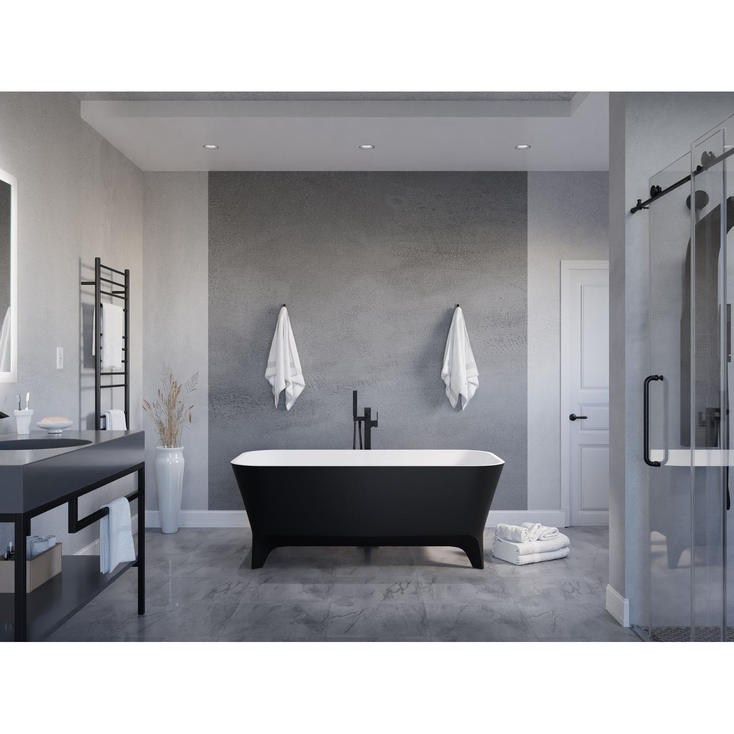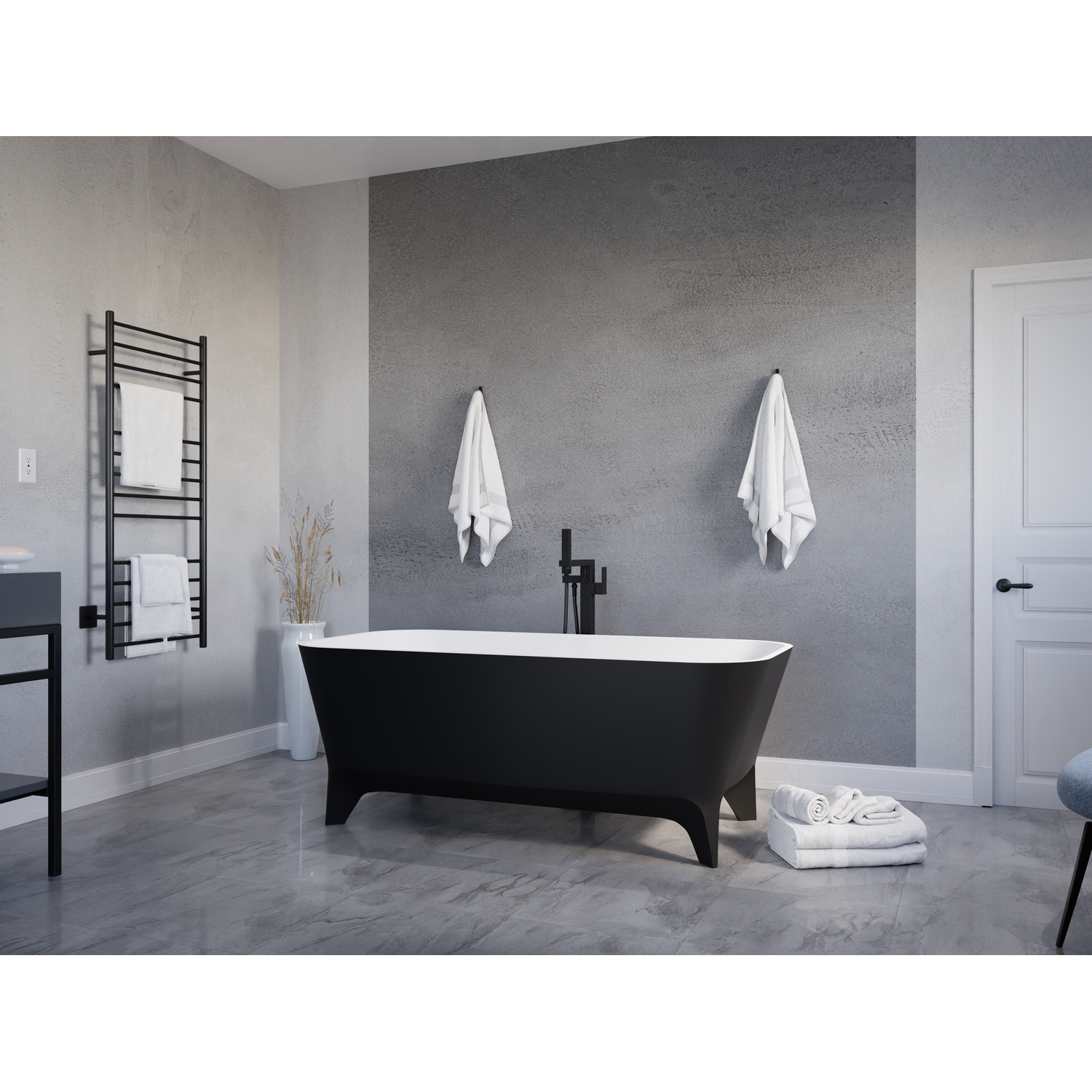 Bring your dream oasis home with the ANZZI Nightshade freestanding soaking bathtub and experience a deeply soothing full body soak. The masterfully crafted basin rests over four elegantly standing feet and finished with a matte black exterior and a smooth all white interior. Introduce the ANZZI Nightshade as the center piece of your bathroom and transform the ordinary into the extraordinary.One Piece Solid Surface man made ANZZI Stone in Matte BlackDesigned for floor or wall mounted filler spout (faucet not included)Built-in chrome overflow and push operated center drain includedRHINO ALLOY certified poly-resin Solid Surface materialOversall dimensions: 63 in. L x 31.5 in. W x 23.6 in. HInterior depth: 17.9 inWater capacity: 79 gallonsAlready pre-plumbed for easy and straight forward installationShips from factory within 24 hours once order is processedLifetime WarrantyTo speak to a knowledgeable and dedicated ANZZI specialist simply call 1-844-44-ANZZI or visit us on the web at www.ANZZI.com