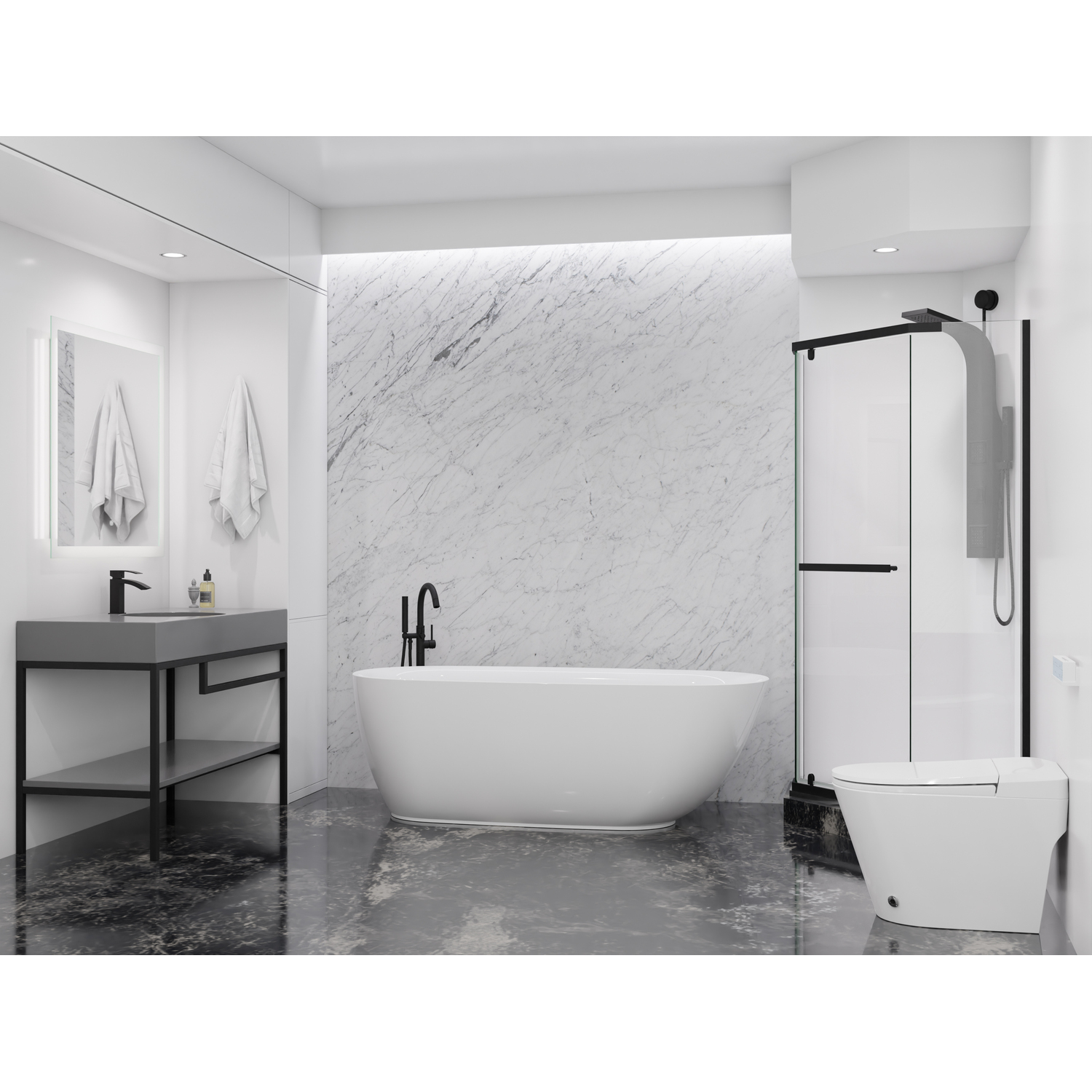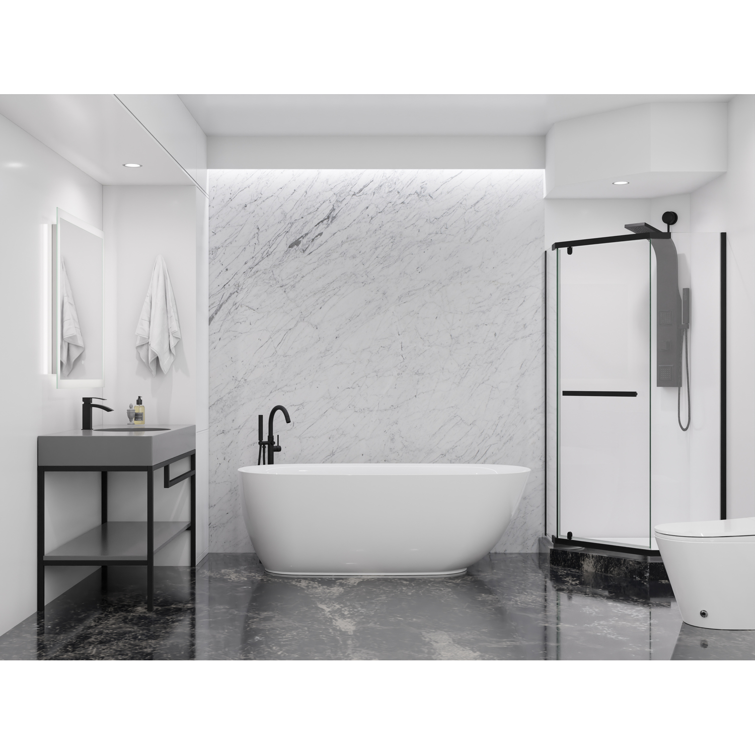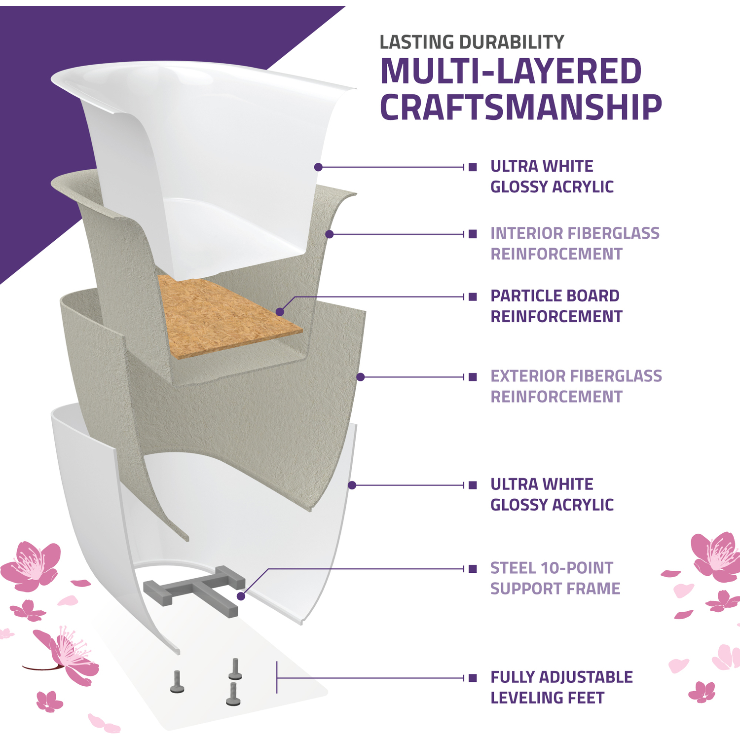 Like what you see? You can make this bathroom suite a reality with ANZZIALSO AVAILABLE FOR PURCHASE (Search #) : Mirror (BA-LMDFX004AL), Vanity (CS-FGC002-MB), Faucet (L-AZ037MB), Freestanding Faucet (FS-AZ0047MB), Shower Door (SD-AZ056-01MB), Toilet (TL-STFF950WH)Fiberglass reinforced and RHINO ALLOY certified high gloss acrylicRoomy interior for a relaxing full body soakDiscreet adjustable feet for a perfect and level installationLow maintenance, easy to clean gloss finishDrain and overflow included with polished chrome trimDIMENSIONS: 59.06 in. L x 29.53 in. W x 22.44 in. HSITTING AREA: 41.73 in. x 22 in.SOAKING DEPTH: 13.78 in.WATER CAPACITY: 79 galProtected by our Lifetime WarrantySlip-resistant floor texture for a more secure footholdPairs perfectly with any ANZZI freestanding faucet (we recommended the FS-AZ0047CH)