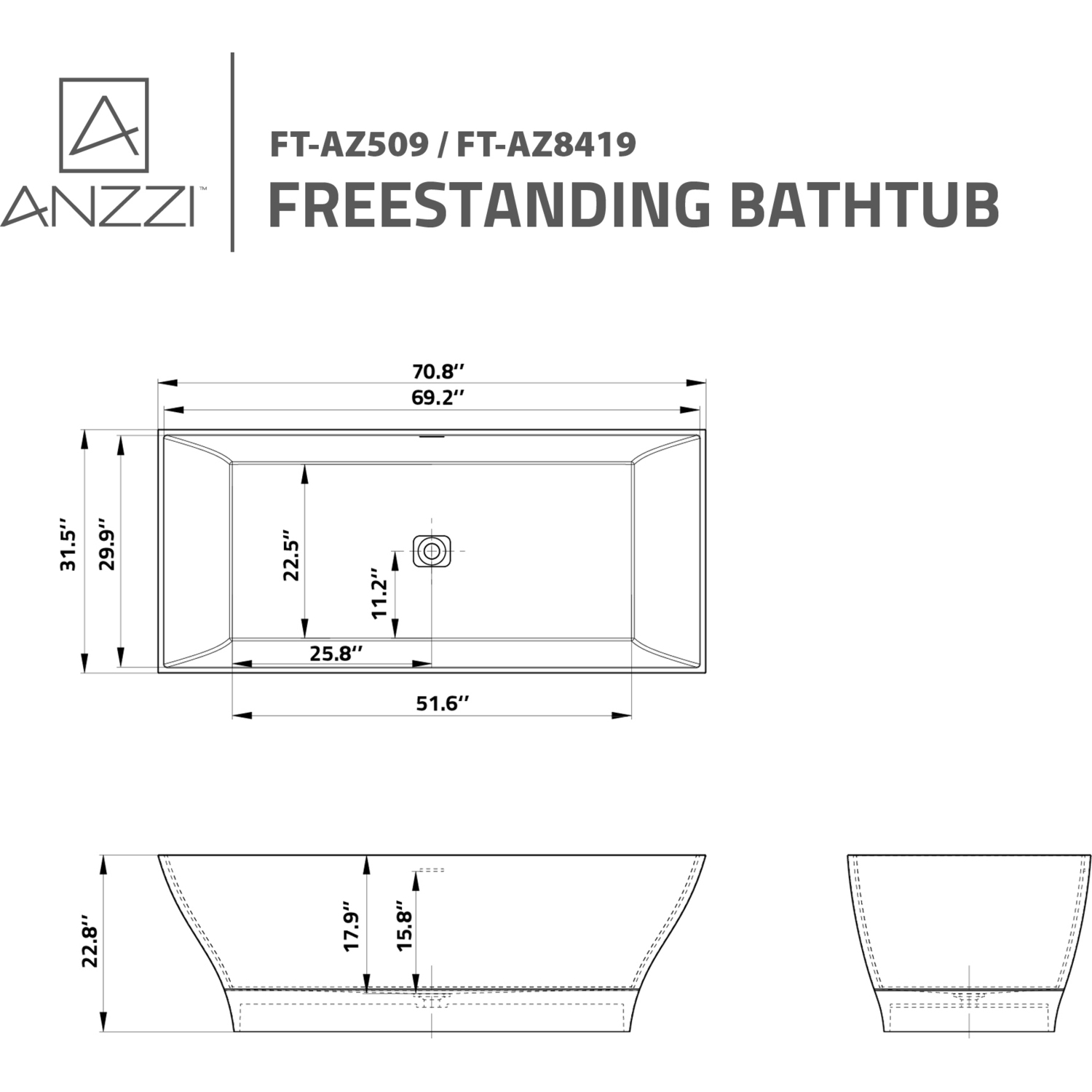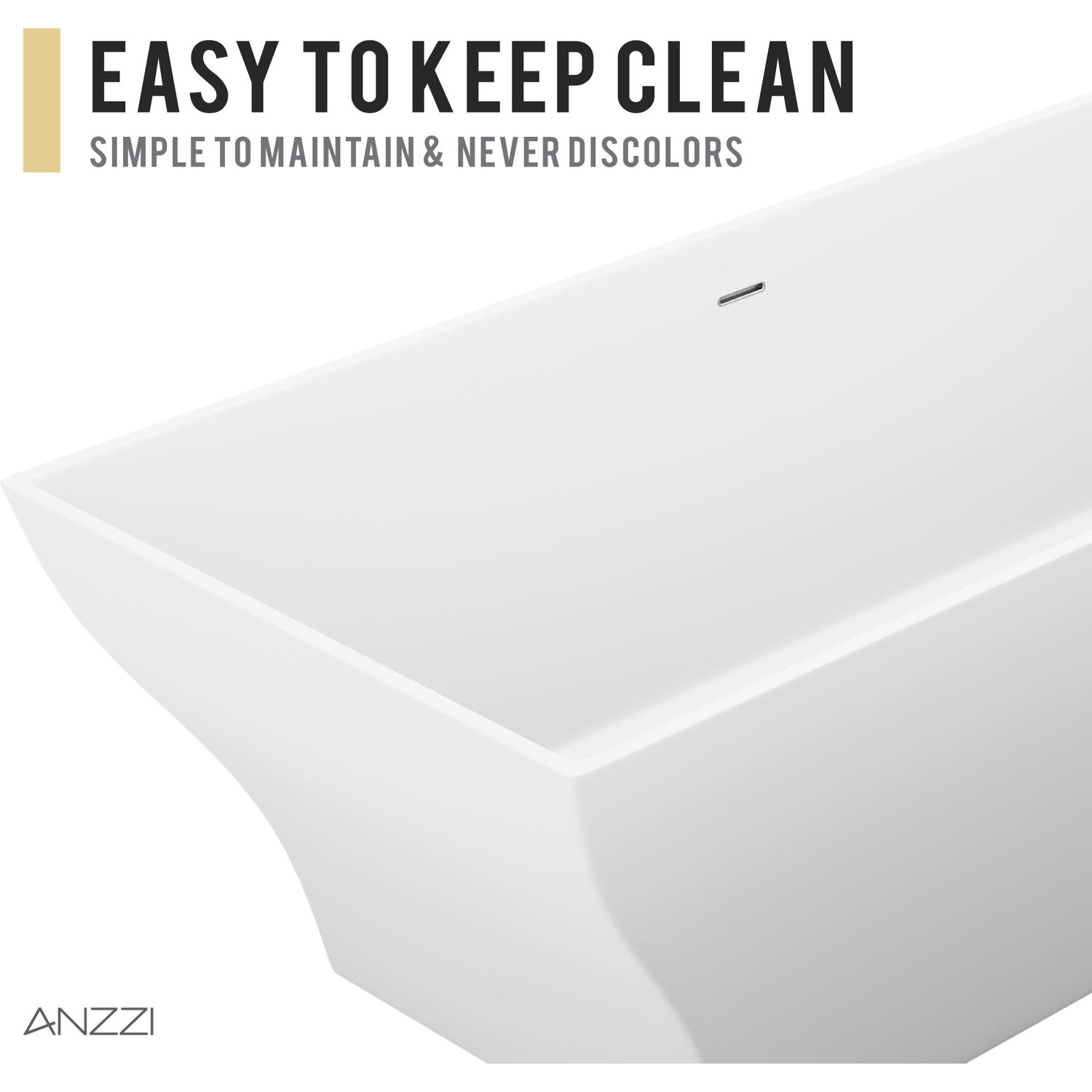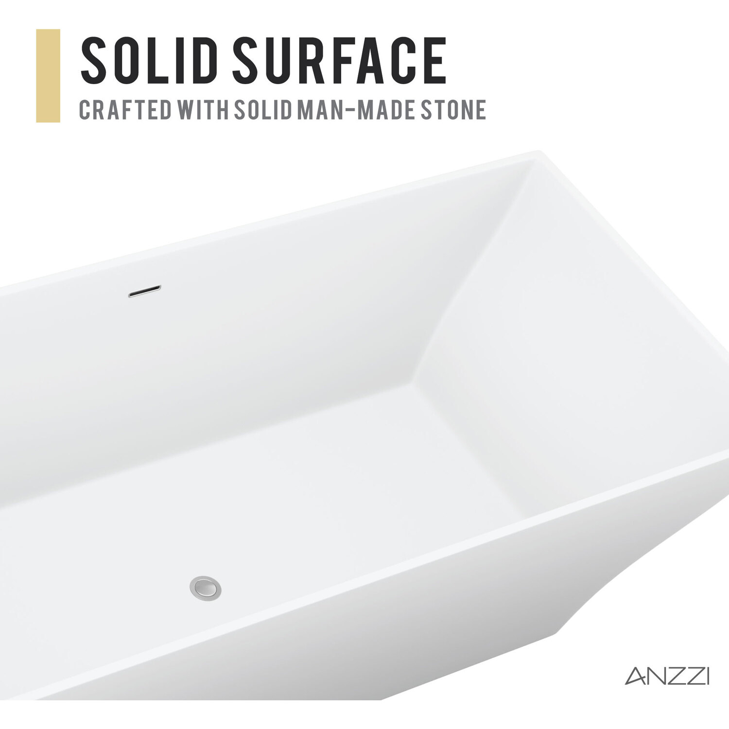 Bring an oasis home with our ANZZI Crema Solid Surface freestanding soaking bathtub. Ergonomically oval designed to cradle the body's form for maximum comfort this tub is styled with a classic and contemporary flair. Relax and drift away while submerged in your personal spa pool.One Piece Solid Surface man made ANZZI Stone in White MatteDesigned for floor or wall mounted filler spoutBuilt-in Chrome Overflow and Push Operated Center DrainRHINO ALLOY certifiedDimensions 70.8 in. L x 31.5 in. W x 22.8 in. HSoaking Depth 15.8 inWater Capacity 90 gallonsTub Weight 370 lbs.Already pre-plumbed for easy and straight forward installationShips from factory within 24 hours once order is processedLifetime WarrantyTo speak to a knowledgeable and dedicated ANZZI specialist simply call 1-844-44-ANZZI or visit us on the web at www.ANZZI.com