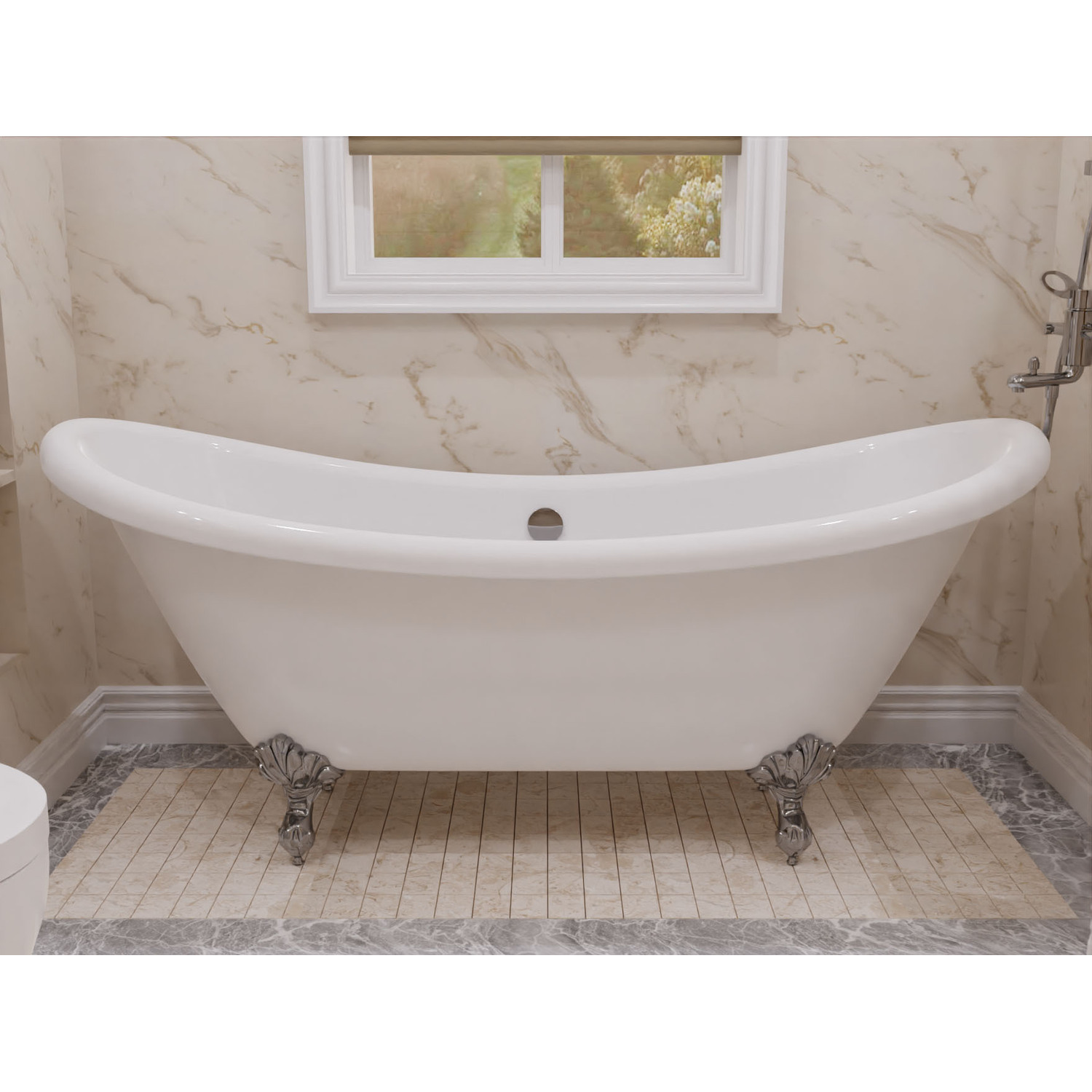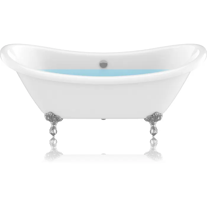 Classic, contemporary and chic all in one, our beautiful Belissima claw foot tub makes a bold statement of style for any bathroom. Soft, sleek lines culminate in a gentle roll around the rim, complimented by the striking contrast of chrome claw feet. The Double slipper design positions faucet and drain in the middle of the tub, giving you the freedom to lounge on either side. Our expert craftsmanship is backed by a limited lifetime warranty that guarantees you’ll enjoy your tub for years to come.High-quality acrylic construction is supremely durableGlossy White finish resists dulling, cracking and fadingPolished chrome finished Eagle's style claw feetLarge freestanding design allows for full-body immersionClaw feet adjust for perfect leveling on any flooringOverflow includedCenter drainExterior dimensions: 69.29”L x 28.35”W x 30.12”HSitting area: 42.52"L x 15.75"WSoaking depth: 14"40 gal. capacityLifetime Manufacturer's WarrantyTo speak to a knowledgeable and dedicated ANZZI specialist simply call 1-844-44-ANZZI or visit us on the web at www.ANZZI.com