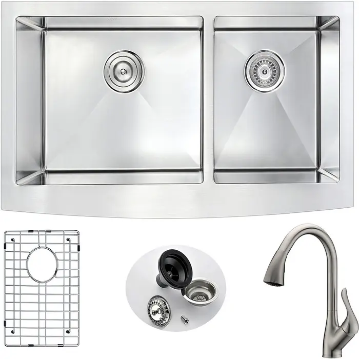 ANZZI presents the 36 in. ELYSIAN SERIES hand crafted farmhouse kitchen sink. Representing the latest in modern home fixture designs and traditional European crafting technique this stunning display of artistry is hand shaped to perfection using RHINO ALLOY certified 18-Gauge 304 stainless steel. Only ANZZI hand crafted farmhouse kitchen sinks utilize RHINO ALLOY certified materials for superior strength and quality. The cavernous 60/40 deep soaking dual basin will comfortably accommodate the largest dish loads including pots, pans and more. And every ANZZI sink features extra-large Echo-STOP sound dampening pads and a layer of protective composite coating to further quiet noise and prevent condensation. We have paired this sink with the ANZZI Accent Kitchen Sink Faucet. Each ANZZI faucet has been certified as Water Sense approved with solid brass construction and valve included. Well defined diversion lines ensure quick and total water drainage and the subtly curved corners allow of easier cleaning. ANZZI carries a proud tradition of crafting long lasting, quality home fixtures. With ANZZI perfection is our tradition.