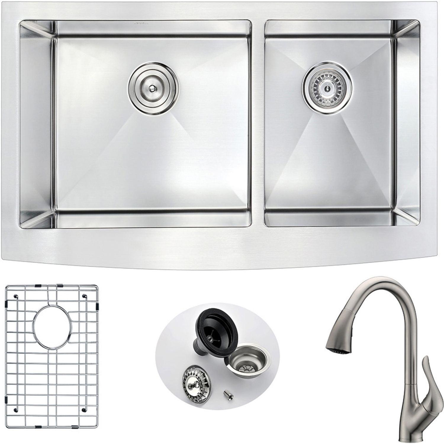 Anzzi Elysian Farmhouse 36 in. Double Bowl Kitchen Sink with Accent Faucet in Brushed Nickel, 848308082997, K36203A-031B