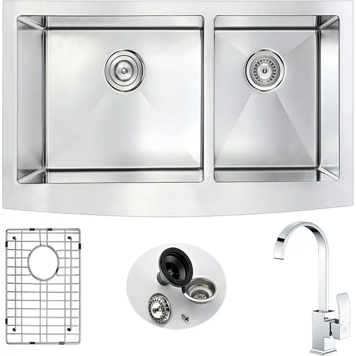 ANZZI presents the 36 in. ELYSIAN SERIES hand crafted farmhouse kitchen sink. Representing the latest in modern home fixture designs and traditional European crafting technique this stunning display of artistry is hand shaped to perfection using RHINO ALLOY certified 18-Gauge 304 stainless steel. Only ANZZI hand crafted farmhouse kitchen sinks utilize RHINO ALLOY certified materials for superior strength and quality. The cavernous 60/40 deep soaking dual basin will comfortably accommodate the largest dish loads including pots, pans and more. And every ANZZI sink features extra-large Echo-STOP sound dampening pads and a layer of protective composite coating to further quiet noise and prevent condensation. We have paired this sink with the ANZZI Opus Kitchen Sink Faucet. Each ANZZI faucet has been certified as Water Sense approved with solid brass construction and valve included. Well defined diversion lines ensure quick and total water drainage and the subtly curved corners allow of easier cleaning. ANZZI carries a proud tradition of crafting long lasting, quality home fixtures. With ANZZI perfection is our tradition.