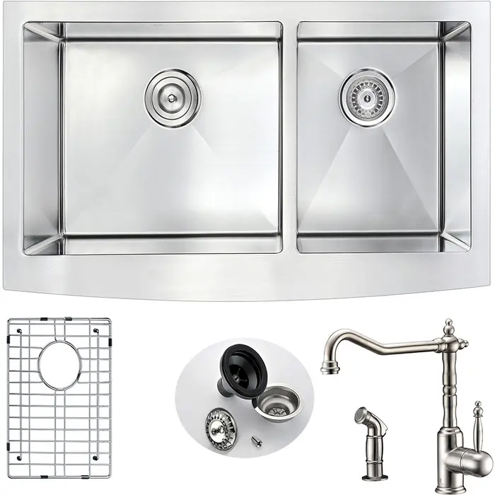 ANZZI presents the 36 in. ELYSIAN SERIES hand crafted farmhouse kitchen sink. Representing the latest in modern home fixture designs and traditional European crafting technique this stunning display of artistry is hand shaped to perfection using RHINO ALLOY certified 18-Gauge 304 stainless steel. Only ANZZI hand crafted farmhouse kitchen sinks utilize RHINO ALLOY certified materials for superior strength and quality. The cavernous 60/40 deep soaking dual basin will comfortably accommodate the largest dish loads including pots, pans and more. And every ANZZI sink features extra-large Echo-STOP sound dampening pads and a layer of protective composite coating to further quiet noise and prevent condensation. We have paired this sink with the ANZZI Locke Kitchen Sink Faucet. Each ANZZI faucet has been certified as Water Sense approved with solid brass construction and valve included. Well defined diversion lines ensure quick and total water drainage and the subtly curved corners allow of easier cleaning. ANZZI carries a proud tradition of crafting long lasting, quality home fixtures. With ANZZI perfection is our tradition.
