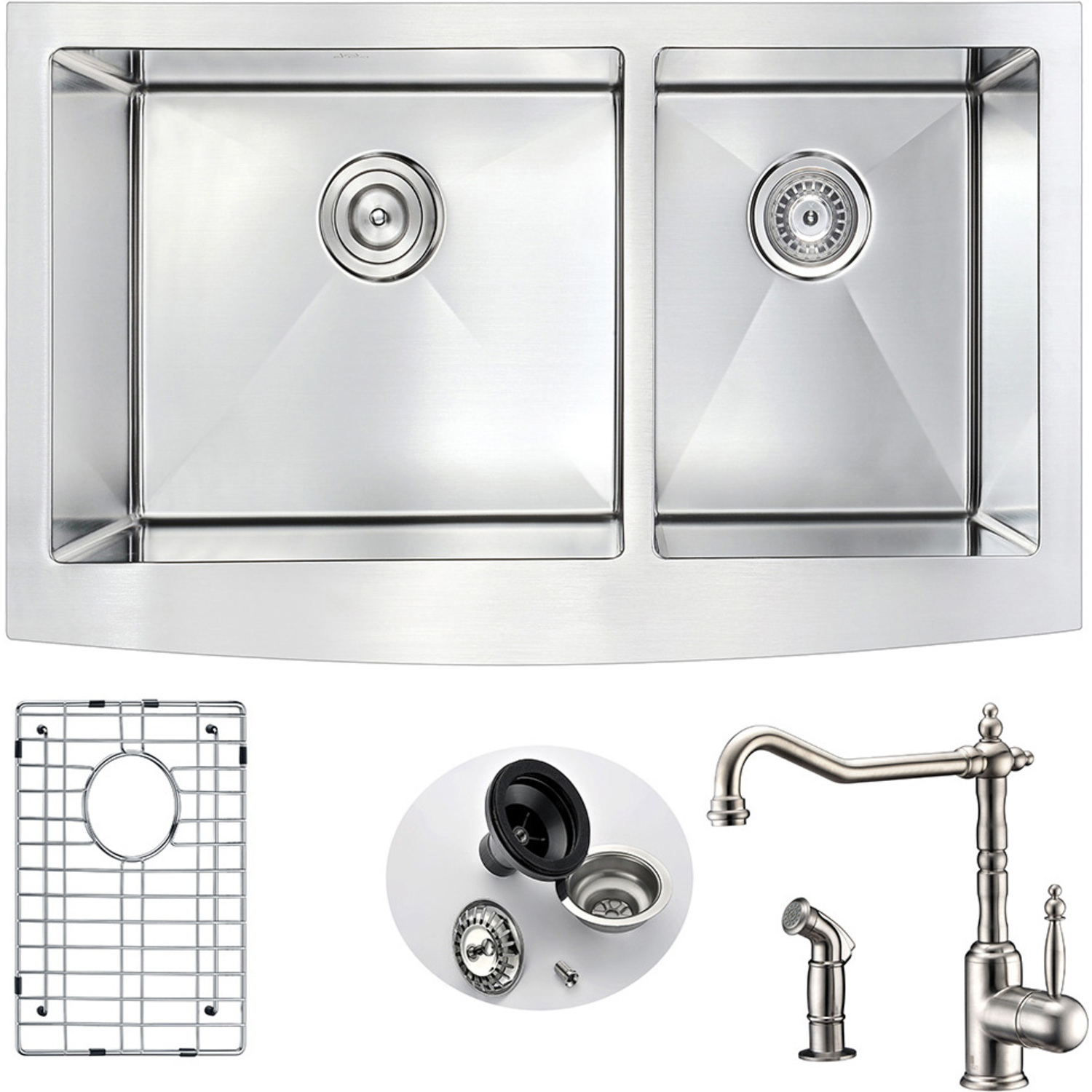 Anzzi Elysian Farmhouse 36 in. Double Bowl Kitchen Sink with Locke Faucet in Brushed Nickel, 848308083086, K36203A-108
